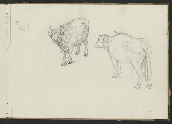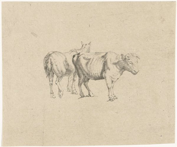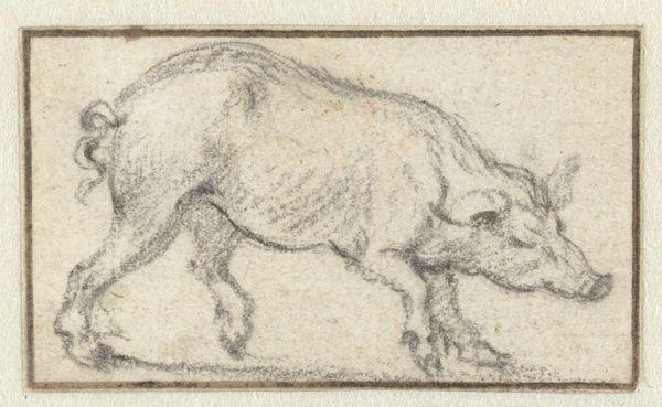 Karel du Jardin’s diminutive drawing presents two pigs rendered with a striking economy of line. The texture of the paper support is integral to the composition, its rough grain mirroring the coarse hides of the animals. Notice how the artist uses hatching and cross-hatching to create volume and shadow, giving a tangible sense of weight to these humble creatures. There's a formal tension between the detailed rendering of the pig on the left, caught mid-stride, and the more abstract depiction of the pig on the right, whose rear view is almost sculptural in its simplicity. Du Jardin seems interested in more than mere representation. The scale invites an intimate viewing experience, demanding close inspection and contemplation. This work challenges conventional notions of beauty, elevating the mundane through skillful manipulation of form and texture. It reminds us that artistic merit can reside in the simplest of subjects, awaiting discovery through attentive looking.
