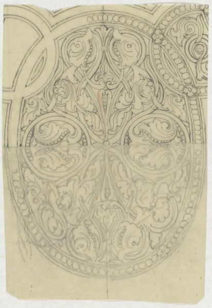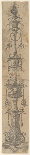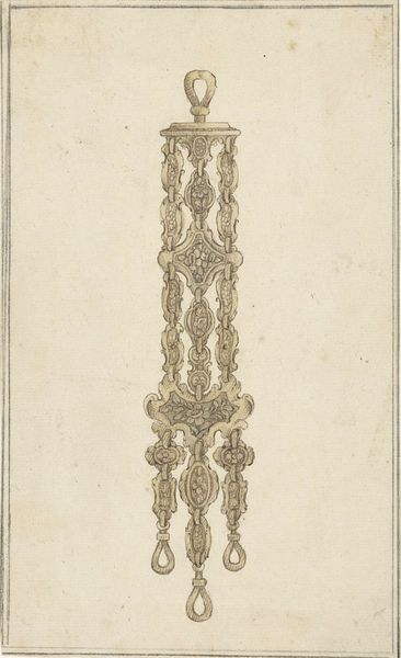 Curator: Look at the whimsy! This drawing, probably rendered in ink and pencil, depicts a chatelaine, dating roughly between 1760 and 1780, an era steeped in ornate detail. It comes to us from the hand of Luigi Valadier. My initial thought? It looks like it wants to dance! Editor: A chatelaine, such an evocative object! These decorative appendages, once dangling from a woman’s waist, held keys, scissors, even watches, transforming everyday necessities into emblems of status and domestic power. What visual echoes do you hear in this particular design? Curator: The Rococo style screams from every curve, doesn't it? Those florid, asymmetrical motifs... they feel like little whispered secrets, the artist reveling in the sheer delight of embellishment, it makes me feel as if someone wants to open some door... Editor: Precisely! These swirling, organic forms reflect a world enamored with nature, but also a desire to conceal deeper meanings. The pendant arrangement echoes the hierarchical structures of the period—each element is meticulously placed to signal rank and societal roles, which might sound like such an artificial prison for a woman of the 1700s, but if she did have this, it would mean power for her. Curator: It's strange to see an object intended to hold keys presented as such an aesthetic... well, flourish. It suggests that even the mundane, the instruments to unlock the pantry or linen cupboard, could become objects of beauty, fantasy. In the same way that, nowadays, something very boring may become precious and a token if it is inherited from someone you loved. Editor: And there’s something profoundly human about that impulse, isn't it? To elevate utility into art. Chatelaines become more than just practical tools, instead, they were reflections of cultural identity, status, taste, and womanhood. Each design element contributing to its social and symbolic meaning. This chatelaine represents an emblem for a very self-aware and creative female spirit. Curator: It also prompts you to imagine the woman who might have worn this...what doors she held the keys to, both literally and figuratively. I'm thinking the drawing is a work of art in itself. Thank you! Editor: A delicate dance between form and function, indeed. Thank you.