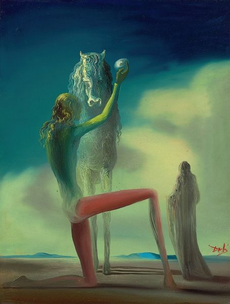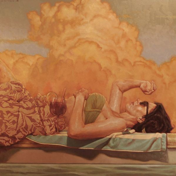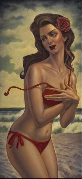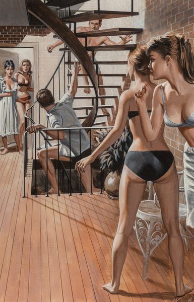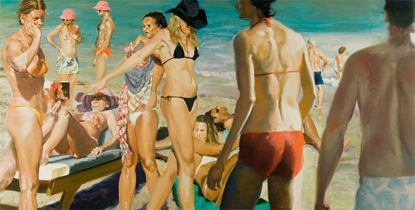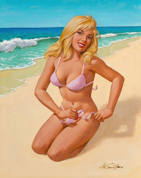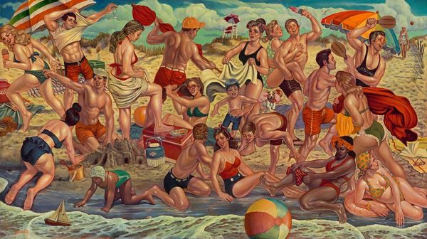 Danny Galieote made this painting, "At Play," sometime in the 20th century, likely using oil on canvas. The artist's material choices clearly influence the work’s appearance. The slickness of oil paint allows for the smooth rendering of skin and the gradation of light and shadow. Galieote's technique is also important: by layering thin glazes of pigment, he builds up depth and luminosity. Though the scene is a casual beachside one, the method of production recalls the traditions of Renaissance painting. The figures are idealized, posed with a studied naturalness, which also reminds us of the history of figurative painting. Yet there is something undeniably contemporary about this image. While the artist makes reference to the history of fine art painting, the image also evokes commercial sources, such as pin-up art. This tension between the fine art and the more commercial realms of image-making invites us to challenge traditional distinctions between them. Ultimately, understanding the artist's process and influences allows for a more informed appreciation of the work's significance.
