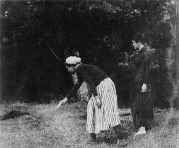 Editor: This is "Photograph" by Thomas Eakins, taken around 1910, a gelatin-silver print. There’s a stillness to it. Two women are depicted in a natural setting, seemingly paused in conversation or perhaps lost in their own thoughts. What strikes you about this piece? Curator: It’s interesting to consider this photograph within the context of pictorialism and realism, two movements Eakins navigated. The image appears candid, almost documentary in its realism, but also consider how it may represent evolving societal roles for women at the turn of the century. How do their poses and attire speak to their place in society? Editor: That's a great point. One woman seems almost hidden in shadow, while the other, in her striped skirt, seems bolder. Is Eakins making a commentary? Curator: Perhaps. Consider the implications of this supposed “candidness” in an era of posed portraiture. To me, the setting also matters: they are by a tree that offers both protection and a stage. Could the tree symbolize nature as a space for female bonding and liberation from constraints? How does the artist portray power dynamics here? Editor: I hadn't thought about the tree as a space itself! It makes me think of women claiming spaces that were historically off-limits. Curator: Exactly! Thinking about visual language, what could we say about photography becoming a medium of empowerment, by subverting visual assumptions about the female gaze and authorship in the arts? Editor: That's fascinating. I'm going to look at Eakins' work through that lens now. It has brought into focus so much I didn't realize was there! Curator: Exactly the aim! It's vital we constantly engage in art not as static objects, but through an exploration of our shared histories and shifting ideologies.