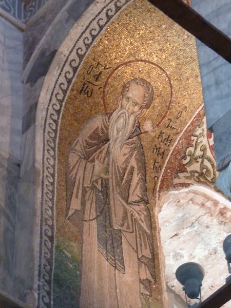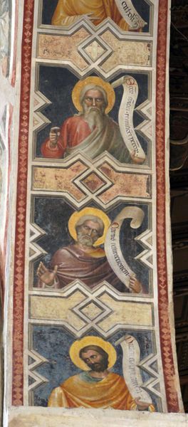 Curator: Here we have a fresco from around 1370, located in the Rinuccini Chapel in the Basilica of Santa Croce. It's by Giovanni da Milano, and it immediately strikes me with its contemplative mood. Editor: It is somber. The figure almost seems to emerge from a muted ground. But tell me more about it. Is it one of a series? Curator: Indeed, this fresco forms part of the larger cycle depicting the Lives of the Virgin and Mary Magdalene. He uses these figures, really, as symbols of repentance, of overcoming social constraints, framed in an interesting moment of Florence’s transition into a more mercantile system, as well as challenges to the strictures of the church in Italy. The composition underscores their place within a patriarchal hierarchy. Editor: You know, what strikes me visually is how the line directs the eye—the curves of the robes, the angle of the saint's posture, it's all designed to maintain the integrity of the form within the space. What's the role of the geometric borders, I wonder? Curator: The artist emphasizes their containment through their careful use of those linear borders. He’s drawing boundaries, defining not only their space, but their expected roles and behaviors within Florentine society. Note the lack of setting too—how different that is to art in France at the same time, and how useful for his message! Editor: Right. The architectural lines confine the saint in an indefinite space and yet create such a strong compositional foundation for his imposing presence. But is the message getting lost? The way that light falls across his face really brings him alive. Curator: Alive and suffering under expectations from the church. Look closely and we can read into how society was shifting at the time through challenges by rising trade guilds. Da Milano reflects societal struggles, really, within the figures themselves. The subtle textures and coloring emphasize their humanity and place within their changing world. Editor: Absolutely. These details encourage us to slow down and contemplate the play of line, the weight of history, and how even within what seems a simple fresco, there are layers of visual and conceptual depth waiting to be discovered. Curator: Exactly. There is this visual encoding of complex themes and this makes this particular fresco an evocative microcosm of its era.