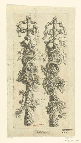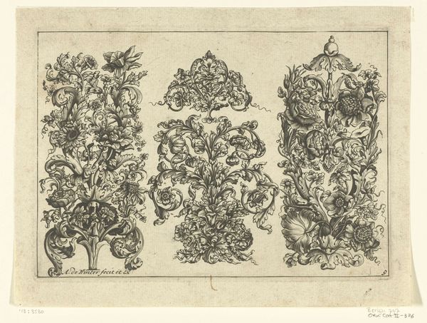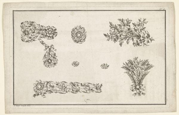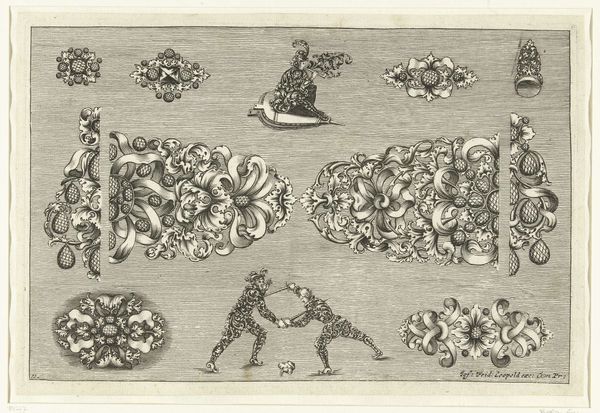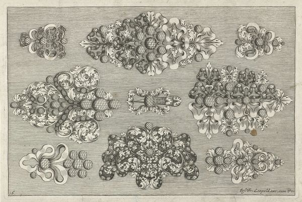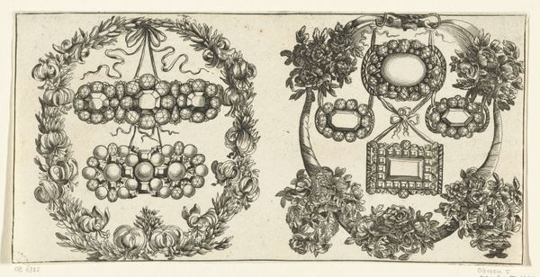 Curator: This work, "Juwelen in cartouches", comes to us from Daniel de Lafeuille. We estimate it was created sometime between 1650 and 1709. Editor: Well, my immediate thought is...frivolous, but in a meticulously rendered way. It's delicate and quite striking, like looking at blueprints for some fantastically expensive chandeliers. Curator: Precisely. De Lafeuille specialized in these kinds of decorative prints, very much in line with the Baroque obsession with ornamentation. What strikes me is how these aren’t just representations of jewels, they are symbolic constructions. Each grouping feels intentional. Editor: The cartouches do seem carefully balanced, almost heraldic. It's interesting how these designs use flowers and ribbons—symbols of status that also soften the potentially harsh geometry of the gemstones. The squirrels in hammocks seem a touch whimsical though, considering the rest. Curator: Don't dismiss the squirrels too quickly! Squirrels symbolize resourcefulness and provision. By embedding them with these symbols of wealth and status, de Lafeuille could be making a comment on how virtue—such as hard work—might underpin material success. Consider that engravings like these weren’t simply aesthetic; they circulated ideas about wealth and morality, influencing elite tastes and self-perception. Editor: That adds a layer, certainly. Thinking about it in a broader context, these weren’t just idle doodles. They served as templates, ideas that could be adapted for furniture, jewelry, even architecture, filtering down into wider visual culture and affecting popular conceptions of luxury. Curator: Precisely. It speaks to the function of prints during the period, how they helped spread visual trends. It makes me wonder, were these accessible to everyone? Or was it specifically catered towards certain elite artisans and patrons, spreading notions of power only within very exclusive circles? Editor: A fascinating question. It raises the specter of exclusivity again, framing even ornamentation as a tool of social distinction. Overall, I find the drawing is intriguing – there's more happening than initially meets the eye. Curator: Indeed. These prints reveal how seemingly straightforward decoration operated within complex networks of meaning, commerce, and societal ambition.
