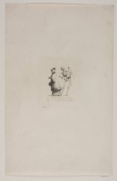 Editor: So, this is "Meisje tilt een kind op om een brief in de bus te doen"—try saying that five times fast! It’s an etching by Paul Nieuwland, dating somewhere between 1875 and 1899. It depicts a girl helping a child reach a letterbox, using ink on paper. The scene feels quite intimate. What story do you think Nieuwland is trying to tell us here? Curator: Oh, I love this! To me, it whispers of shared secrets, of collaborative mischief! You know, think about it: the girl lending her strength, the child eagerly posting the letter… it’s like they’re co-conspirators in some sweet, old-fashioned adventure. The etching itself, the way Nieuwland used the lines...they almost feel like threads connecting these two. Have you ever felt like you were a part of something secret like this? Editor: Definitely! It reminds me of childhood escapades with my cousins. The lines really do give it a delicate, almost dreamlike quality. But why this specific scene? What could posting a letter possibly signify beyond the literal act? Curator: Ah, the magic question! Letters, back then, were often lifelines, weren’t they? Think of soldiers far away, lovers separated… Perhaps this letter contains a heartfelt plea, a whispered wish, or maybe just the simple, joyous sharing of news. The smallness of the figures against the starkness of the paper also plays a role, making you feel as though you are peering into a private world. It invites speculation! What's your gut feeling about its message? Editor: I’m thinking maybe a love letter! All that conspiratorial energy... It gives such a lovely spin to everyday life. This reminds me to pay more attention to the subtle gestures and stories around me. Curator: Precisely! Art's finest trick is taking the mundane and turning it into pure gold. It encourages you to imagine backstories and add layers to an otherwise easily dismissible ordinary experience!