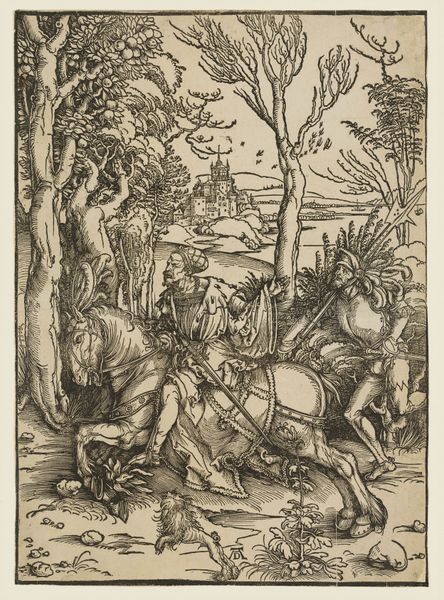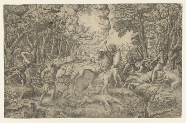 Editor: This is "A Wolf Hunt, with a Dead Ram as Bait," by Antonio Tempesta, made as an engraving. It depicts a hunting scene, and I'm struck by the clear depiction of labor involved in hunting. What catches your eye when you look at this piece? Curator: I'm drawn to how Tempesta transforms copper into a narrative about resource control. Think about the material cost of copper in the 16th century, and who had access to it. Does this image celebrate hunting as sport, or does it reveal the economic underpinnings of access to food and land? Editor: That’s a perspective I hadn’t considered before. I was only thinking about the hunt itself. Curator: Exactly. What about the circulation of these prints? Were they luxury items, or a form of mass communication? Considering these questions reframes our understanding of the image. Editor: Seeing it as a record of material production and consumption gives the scene a whole new meaning for me. Thanks for pointing that out!