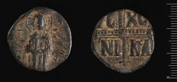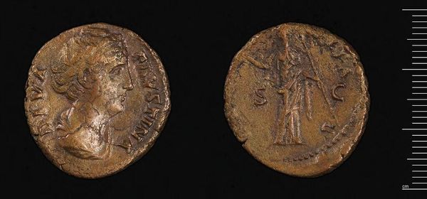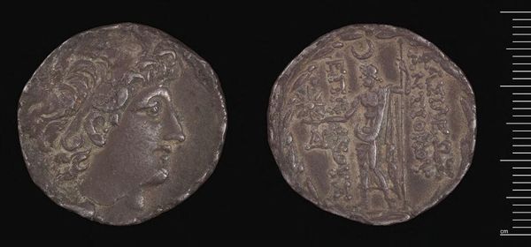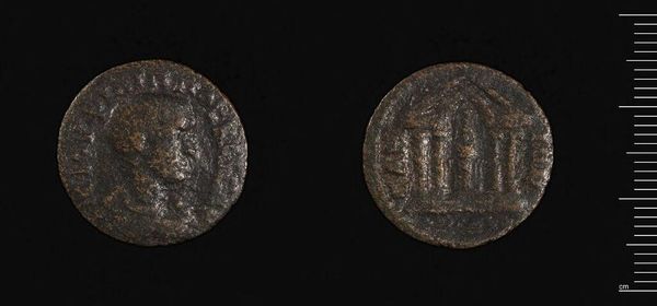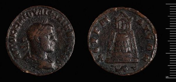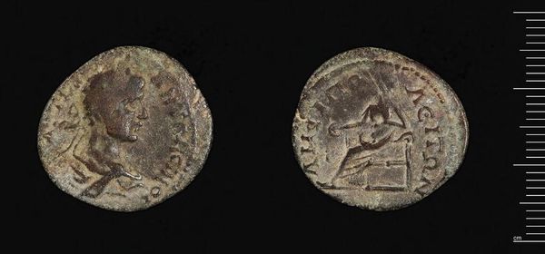 Editor: Here we have a coin of Berytos under Elagabalus from the Harvard Art Museums. The details are incredible, even on such a small, aged object. What strikes you when you look at it? Curator: The incuse relief presents a fascinating study in form. Note how the artist manipulates positive and negative space to articulate the imperial portrait and architectural details. The very act of impressing such designs onto metal imparts a unique aesthetic. Editor: So the process itself is key to understanding it? Curator: Precisely. The physicality of striking the coin, the resulting textures, all contribute to its visual language. Consider also how the coin's circular form dictates and contains the composition. What have we learned? Editor: I see the skill involved now, and the artistic decisions behind what seems like a simple object.