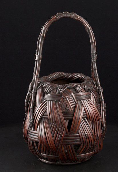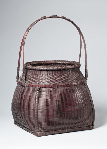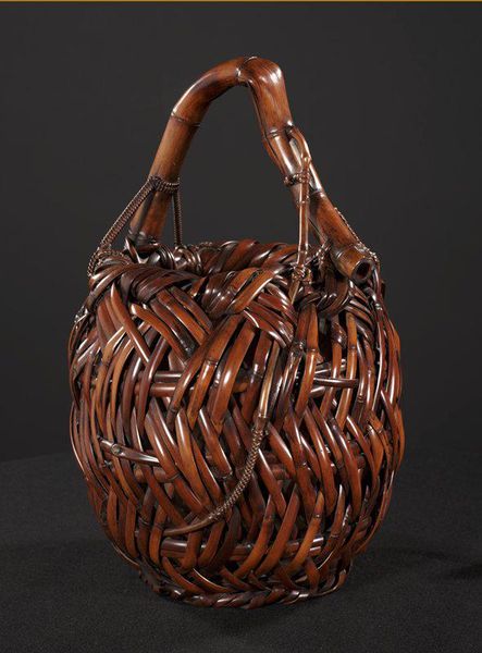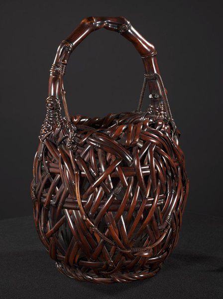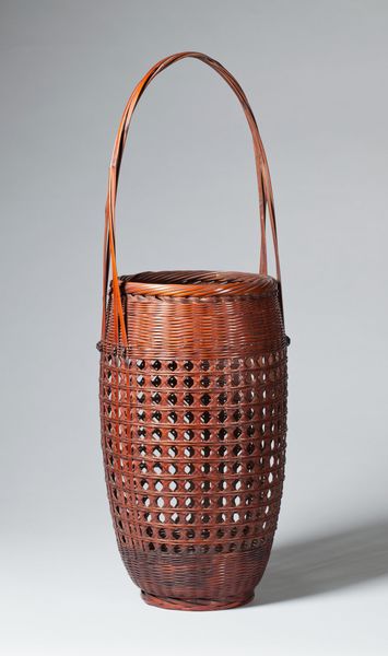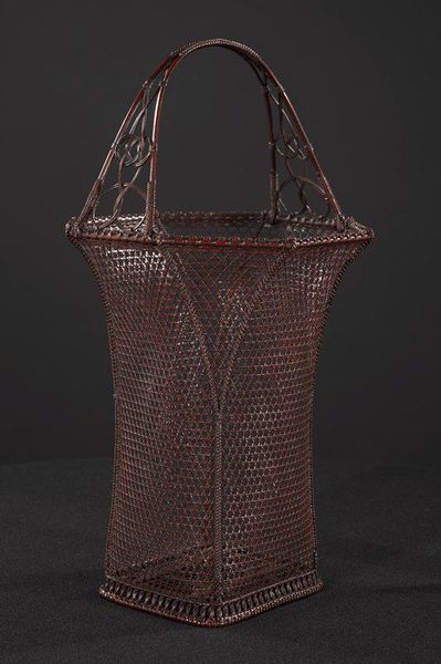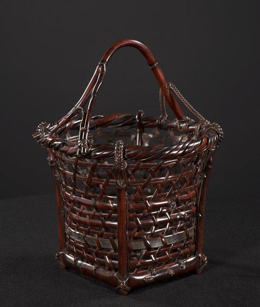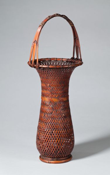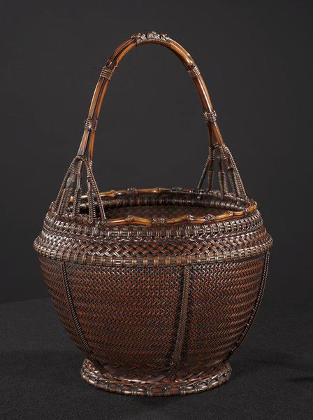 Editor: This lovely "Footed Flower Basket," possibly from 1929, was crafted by Maeda Chikubōsai, utilizing wood and ceramic. The craftsmanship feels very detailed; what can you tell me about this particular piece? Curator: Examining the basket from a formalist lens, one is immediately struck by the texture and the structural integrity achieved through weaving. The interplay between light and shadow created by the woven bamboo constructs a complex visual experience. How does this structure inform the artwork as a whole? Editor: It feels simultaneously rigid and delicate. It’s sturdy, but the gaps in the weave create a sense of lightness, preventing it from feeling too bulky. Do you think the negative space has a significant role? Curator: Indeed, the negative space is integral. Consider it not just as emptiness, but as an active element participating in the definition of form. The lines, intervals, and overall pattern are essential. It contributes to a sense of permeability and depth. This basket is an exploration of geometric rhythm, isn’t it? Editor: It absolutely is! There is something comforting in the symmetry. Could this basket transcend its function and be seen as sculpture? Curator: That’s insightful. The functionality of this flower basket does not detract from its artistic merit, especially as it challenges preconceived notions. Editor: Looking closely, the uniformity and precise detailing seem integral to the overall form, I notice more intricate layers with each viewing! Curator: Precisely. Form triumphs, making way for contemplation. This emphasis isolates our awareness of texture, volume, and light. What initially seems plain reveals hidden sophistication in materiality and configuration. Editor: That’s a completely different way of approaching and seeing it! I am so glad I know about it.