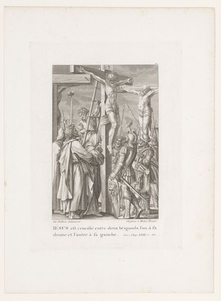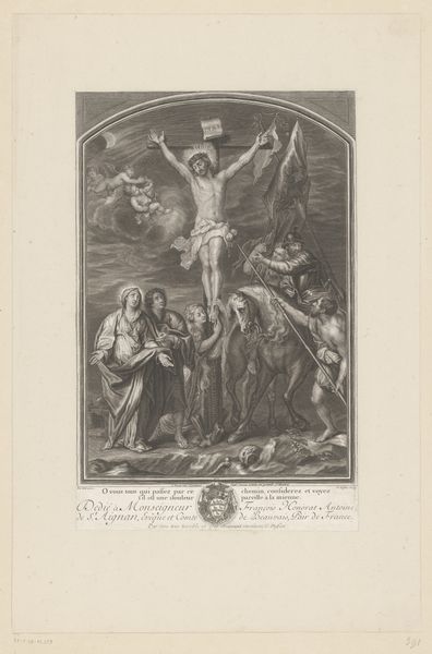 Editor: This engraving, "Kruisiging," or "Crucifixion," by Michel Aubert, dated 1722, presents such a powerful, tragic scene. The strong use of light and shadow really emphasizes the drama of the moment. How do you interpret this work, especially in terms of the symbols that resonate within it? Curator: It's compelling how Aubert uses the visual language of the Baroque to amplify the emotional weight of the crucifixion. Beyond the immediately recognizable elements – Christ, the cross – consider how figures like Mary Magdalene represent grief, the Roman soldiers embody power, and even the darkening sky functions as a symbol of divine anger or mourning. Do you see how these familiar archetypes are deployed to elicit an almost visceral reaction in the viewer? Editor: I do. The way those figures are rendered definitely amplifies the emotional impact, almost manipulating the viewer's response. So it’s not just the narrative, but how that narrative is conveyed visually. Curator: Precisely! And consider that visual language wasn't simply aesthetic, but also functioned as a shared cultural memory. Each figure, each element carries centuries of accumulated meaning. What feelings are evoked by the figures at the base of the cross, the way they're huddling together? Editor: I guess despair and grief? That collective suffering adds to the individual pain, making it almost universal. Curator: Indeed. Aubert masterfully utilizes established iconographic symbols to tap into our shared understanding, making the scene feel both historically specific and eternally relevant. It is a narrative but one loaded with cultural memory and meaning that carries through time. Editor: That’s really insightful. I hadn’t considered how deeply rooted the imagery is, or how Aubert intentionally drew upon that pre-existing understanding. Curator: And that's how a single image can become such a potent carrier of cultural values, fears, and beliefs across generations. Editor: I see that now. It is fascinating.