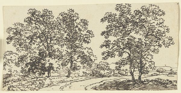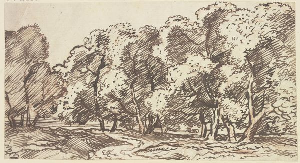 Franz Kobell made this landscape, Group of Trees, sometime around the late 1700s or early 1800s, using pen and brown ink on laid paper. Laid paper has a unique texture, created by the wires of the mold used in its production. This texture is visible in the drawing as subtle lines running across the surface. The artist's choice of materials emphasizes the direct, unmediated connection between hand and surface. Pen and ink allowed him to capture the scene with spontaneity. The brown ink creates a warm tone, evoking a sense of light and atmosphere. The lines vary in thickness, which brings depth and dimension to the composition. Kobell uses hatching and cross-hatching techniques to build up the forms of the trees and foliage. The simplicity of the tools and the artist's skill are central to the image's aesthetic effect. Ultimately, this drawing shows how even simple materials, combined with skilled technique, can produce a rich artistic expression. By attending to the material qualities of the artwork, we gain a deeper appreciation of the artist's vision and the historical context in which it was created.