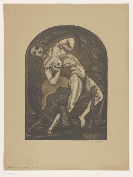 Editor: Here we have Henk Schilling’s "Verstrengelde, naakte man en vrouw" or "Entangled, Naked Man and Woman," created in 1919. It's striking how the muted tones and intertwined figures create such a strong sense of intimacy, but also almost…suffocation. What’s your take on it? Curator: Considering the historical context, right after the first World War, this work resonates with a larger cultural narrative. The war devastated a generation, and this image perhaps explores the desire for connection and comfort amidst widespread trauma and uncertainty. Does this embrace appear consensual to you, or are you perceiving tension? Editor: I definitely see the tension now that you point it out. It seems less romantic and more… desperate, maybe? Is the fact that they are nude significant? Curator: Absolutely. Nudity here can signify vulnerability, stripping away societal constructs to reveal the raw, human need for solace. Many artists explored the human form in that era, using it to represent primal emotions and anxieties. But I also wonder, what were the public displays of intimacy like in 1919? Could this pose be viewed as controversial? Editor: Probably pretty controversial. So, you are saying the cultural mood probably helped influence how this intimacy was displayed by Schilling? Curator: Exactly. It shows that intimate moments, too, are impacted by larger historical currents and are, indeed, quite political. It seems art is more involved than simply reflecting social contexts; it engages in a nuanced dialogue. Editor: I see it now. Thank you! It is as though we also need to recognize its entanglement with historical and political factors. Curator: Indeed, a good way to approach much of art history.