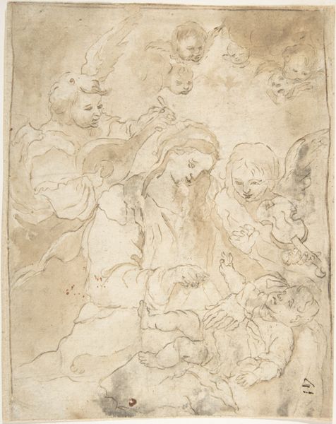 Ubaldo Gandolfi created this ink on paper drawing of ‘The Virgin of the Immaculate Conception’ in the late 18th century, a period marked by the Enlightenment's challenge to traditional religious authority. The piece depicts the Virgin Mary surrounded by angels, standing over a vanquished serpent. Gandolfi’s Virgin is a study in the idealized feminine form, embodying purity and grace, yet her power comes from her divine role as the mother of Christ. This connects to the historical context of the Catholic Church’s emphasis on the Virgin Mary as an intercessor and a symbol of hope. The Immaculate Conception itself speaks to complex dialogues around female sexuality, divinity, and the unique position of Mary within the Catholic faith. Gandolfi’s work invites us to reflect on the historical construction of female identity within religious narratives, and the emotional power vested in figures like the Virgin Mary.