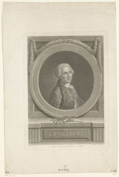 This is a monochrome print titled "Portret van Renaud-Philippe de Custine" made by Theodorus de Roode in the late 18th century. The portrait is framed within an oval, which is then set against a textured, rectangular backdrop. De Roode plays with geometric forms to create a composition that feels both formal and somewhat theatrical. Below the portrait, a rectangular block bearing the name "Custine" is supported by stylized architectural elements, resembling classical pillars. This elevates the subject, suggesting nobility and stature. The use of hatching and cross-hatching creates tonal variations, adding depth and volume to the figure and the surrounding architectural motifs. The clean lines and precise execution speak to the values of the Enlightenment, emphasizing order and clarity. However, the very act of framing the figure, of placing him within these constructed forms, raises questions about representation and the role of portraiture. The image doesn’t merely reflect reality; it actively constructs it. It offers us a glimpse into the artistic and philosophical concerns of the time.