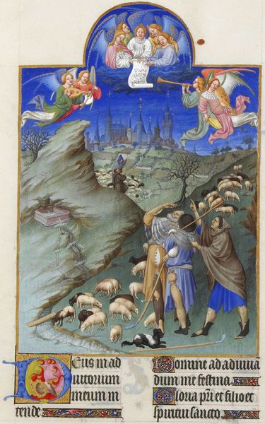 Zanobi Strozzi crafted this miniature, "Initial Q with a Procession of Children," using tempera, paint, gold, and ink on parchment. The composition arranges a group of children in a landscape within the curvature of the letter "Q," immediately drawing our eyes to the interplay between the natural scene and the structured form of the initial. Note how the gold leaf not only provides a radiant backdrop but also flattens the space, typical of early Renaissance art. The artist uses a semiotic system of color, where the blues and golds denote sanctity and importance, commonly found in religious iconography of the period. The placement of the children, seemingly emerging from a mountainous background, invites interpretation. Are they symbols of innocence, or perhaps a representation of a biblical narrative? It's this tension between the decorative function of the initial and the narrative potential of the scene that encourages ongoing interpretation. The formal qualities of the artwork function aesthetically and as part of a larger cultural discourse.