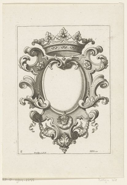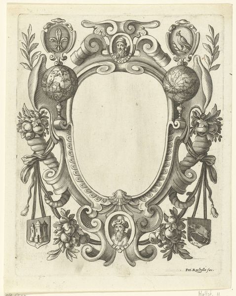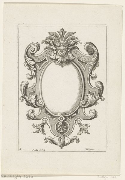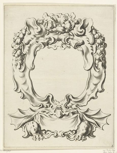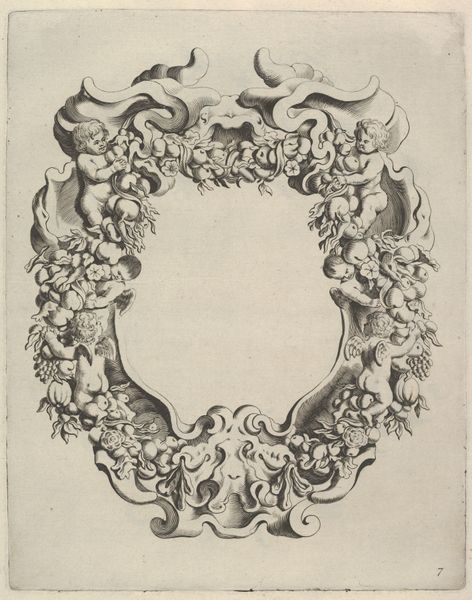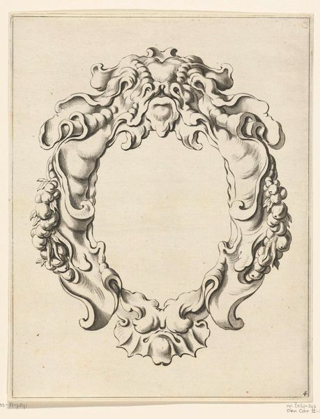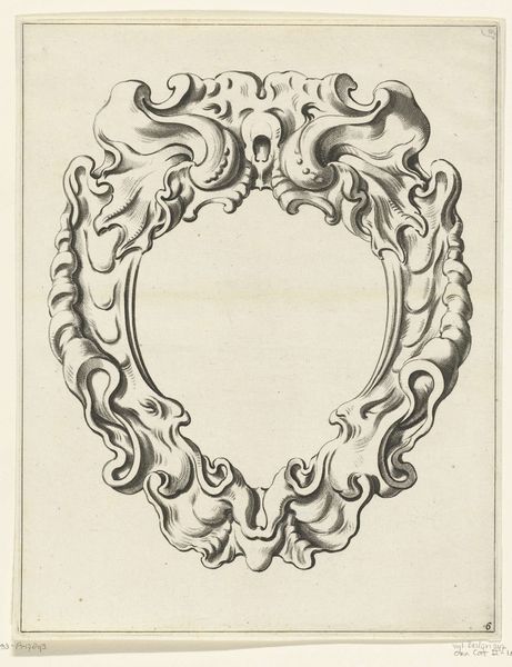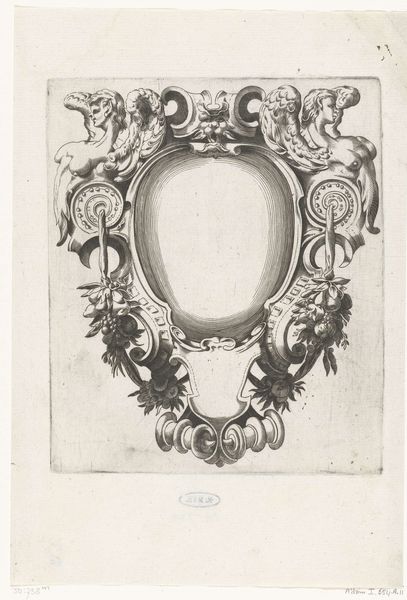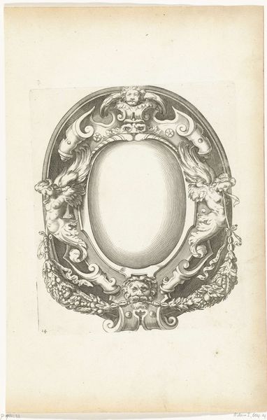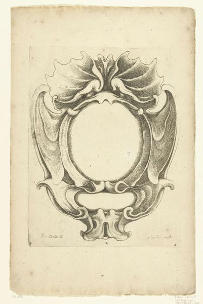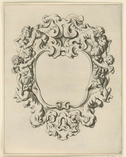 Pieter Hendricksz. Schut created this ornamental cartouche sometime in the mid-17th century using etching. This is an intaglio printmaking technique, where the artist uses acid to cut lines into a metal plate, which is then inked and printed. The bold, swirling forms owe a debt to auricular style, popular at the time. It mimicked the shapes of the ear and other bodily forms. Look closely, and you can see fleshy lobes and shell-like curves. The etcher’s line renders these in stark black and white, giving a sense of depth. The cherubic figures at the top soften the image, contrasting with the somewhat grotesque features of the broader frame. Prints like these were made for dissemination. This one would have been used by other artisans – perhaps wood carvers or silversmiths – looking for inspiration. This reminds us that while we might see craft and art as different categories today, they were once much more closely linked by the circulation of design ideas.
