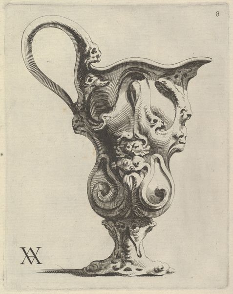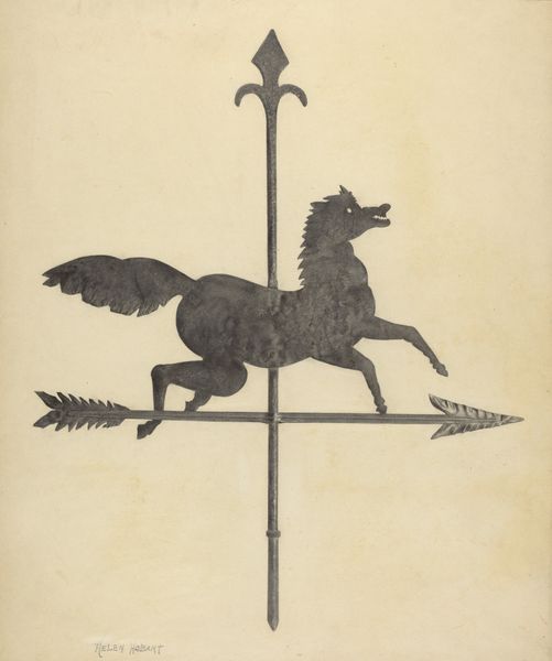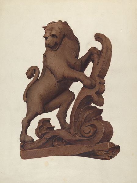 Curator: This is Alice Stearns's "Unicorn," a drawing rendered around 1937, primarily using pencil and charcoal. What springs to mind for you? Editor: There's a melancholy in it, even with the dramatic pose. It's a trapped unicorn, really, not prancing free in some enchanted forest, which feels rather subversive. Curator: Subversive how? Unicorns have a complex lineage, often linked to purity and grace, but also power. Here, constrained by chains, that power feels... misdirected? The adjacent scroll element seems to mirror the pose while simultaneously mocking the imprisonment through uninhibited flowing form. Editor: Exactly. And that rendering… it's incredibly detailed but almost lifeless, like a carving of a unicorn rather than a living creature. The meticulous realism only accentuates the lack of… magic, I guess? It's as if the unicorn has been turned into a trophy, studied, and possessed. Curator: Notice also that the texture, especially around the chain and the muscular definition of the animal, presents an element of tactile vulnerability, highlighting themes of control and exploitation within established mythic contexts. Even the realism you mentioned serves to ground that narrative. Editor: The details give a sculptural effect as though it were chiseled, which makes it less believable as an entity in time. So maybe the magic lies in Stearns's ability to take this beacon of untamed myth and drag it into a world of industry and mass production. And the monochrome color choice feels so heavy... a physical embodiment of suppressed freedom. Curator: Perhaps. Considering that this piece comes from the late 1930s, a time of immense social and political upheaval, one might even suggest that the unicorn embodies something far larger, a captured ideal wrestling against the constraints of impending global conflict. Editor: Wow. A tiny little poignant time capsule—not so monochrome now. Curator: Indeed. Symbols seldom reside on the surface. Stearns seems to have seized on that age-old truism, gifting us this thought-provoking, deceptively subtle commentary on captivity. Editor: Yeah, I might think twice now before buying the sparkly unicorn on a mug. A real mind-opener, actually.