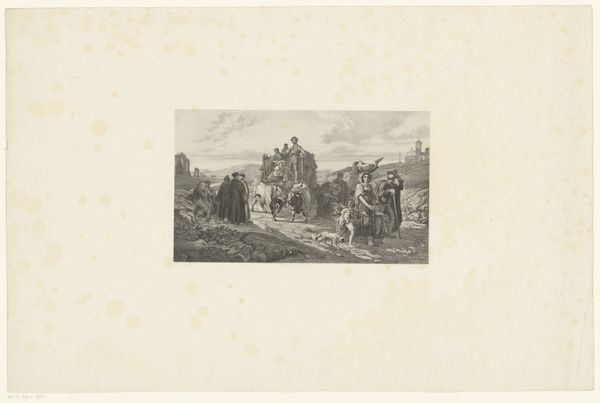 Johan Conrad Greive created this print, ‘Laying the first stone of the Sint Antonispoort’, using etching and drypoint techniques. The composition divides the scene into distinct zones: the dense crowd, the architectural backdrop, and the open sky above. The figures are rendered with meticulous detail, each face and garment contributing to the overall texture of the scene. Greive's use of line is particularly striking; he varies the weight and density of the lines to create a sense of depth and to differentiate between foreground and background elements. The contrast between the solid, weighty forms of the architecture and the more fluid, dynamic rendering of the crowd introduces a play of oppositions. This interplay might be seen as a reflection on the relationship between civic structures and the populace they serve, or even as a metaphor for the tensions inherent in urban development. The print invites us to consider how an image, through its formal elements, can encapsulate complex social and historical narratives.