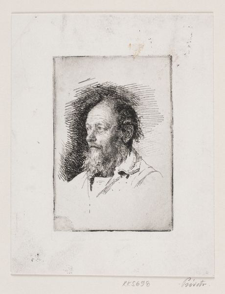 This is Johann Andreas Benjamin Nothnagel's etching titled "Boerenman," created in 1771. During the 18th century, representing individuals from lower social classes was often intertwined with political and social commentary. Nothnagel, working within this context, presents us with a man whose gaze holds a story of resilience. It’s interesting to consider how class distinctions were portrayed through art, and what role these images played in shaping societal perceptions. The man's weary eyes and unkempt appearance speak to a life of labor, but also perhaps to a certain dignity. There is something in the tilt of his head, his direct gaze that suggests we see him as an individual, rather than a type. Ultimately, Nothnagel's etching is a nuanced exploration of identity, inviting us to reflect on the complex interplay between representation, social class, and individual experience during this period.