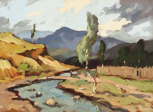 Elena Bontea's painting presents an open vista of a pastoral landscape rendered with an almost scientific attention to the interplay between light and shadow. The composition is structured by a clear horizontal division, grounding the scene with foreground elements and a progression into distant mountains under a broad sky. The material handling is evident in Bontea’s brushstrokes, which construct not just forms, but also a semiotic language that communicates themes of rural existence. Bontea uses a restricted palette focusing on earth tones, but manages to convey a subtle yet effective articulation of place and life. The structure within the painting invites us to consider how Bontea destabilizes the traditional landscape genre, integrating figures into the scene without idealizing them. The river, trees and clouds, serve as structural elements that offer a commentary on labor, land, and the everyday. The material qualities and the landscape’s form are united in a discourse on the function of art to represent and interpret nature. This painting acts as a mirror, showing us our own interpretations of nature and our role within it.