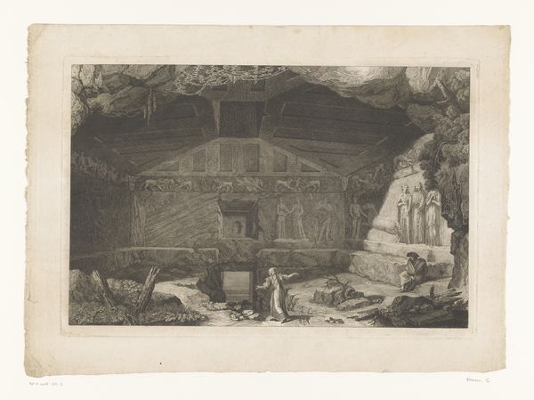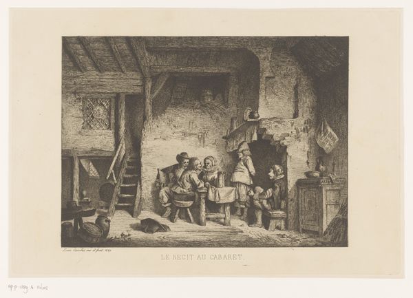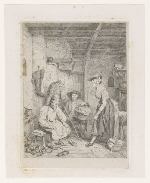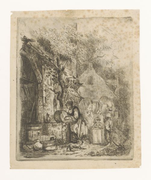 Editor: This is Jean Jacques de Boissieu’s "Stable Interior with a Man Surrounded by Five Children", an engraving from 1780. The print offers a snapshot of what seems to be everyday life, blending figures with the mundane: livestock and domestic duties all in a shared interior. It’s quite detailed, given the medium. How can we approach understanding a piece like this? Curator: It’s fascinating how De Boissieu collapses distinctions. We see 'high art' strategies, like the careful arrangement of figures, applied to the quotidian reality of labor, to farm life. Notice how the texture achieved through engraving – think about the labor involved – imitates the grit and roughness of the stable itself. What does the very material of the artwork tell us about the subject? Editor: That's an interesting perspective! I was focused on the human element and narrative aspect, but you're right, the material speaks to a whole different meaning about work itself. Curator: Exactly! It’s easy to overlook, but consider the socioeconomic context. This was made on the eve of revolution. Are these images of labor just that? Or are they subtly examining the social structures and the roles within them? Look at the tools that are around in the engraving. What are these ordinary people actually doing? Editor: The man appears to be an overseer with all the children in one area, while there is someone possibly milking a cow. It speaks to social class. Curator: Precisely. It is these interactions between subject, material, and means of production, that unlock how the print can engage with societal questions about labor and value, even if subtly. It's the blending of genre, landscape, and the details of technique. Editor: This is a great reminder that appreciating art involves really thinking about the labor behind creating the image, and how that informs the context and content. Curator: Yes, analyzing an artwork involves recognizing the importance of the making in relation to its representation. Thank you.