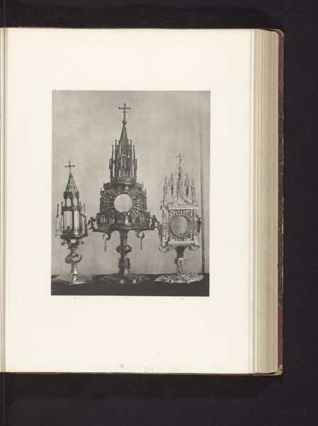 Editor: Here we see a photograph of three silver monstrances containing relics. The photograph was taken before 1866 by Joseph Maes at an exhibition of religious objects from the Middle Ages and Renaissance in Mechelen. These ornate objects are incredibly striking. What sort of symbolism do you see embedded within them? Curator: Well, first, notice the repetition of verticality—each monstrance aspires upward. This symbolizes a reaching towards the divine, a very common motif across religious art. And consider the material itself: silver. It represents purity, clarity, and light – qualities associated with holiness. But it's more than mere aesthetic choice; it echoes centuries of belief. Editor: So the material isn't just about looking good; it's actively communicating a message? Curator: Exactly. The visual vocabulary is steeped in meaning. Each form holds significance. The relics themselves, housed within, would have been potent symbols of connection to saints or specific religious narratives. Editor: That’s fascinating! I never considered how potent everyday objects could become when charged with this kind of symbolic meaning. It’s almost like they're memory repositories. Curator: Precisely! These aren't just decorative objects; they are cultural anchors, embodying centuries of faith and artistry, offering us glimpses into the spiritual lives of those who created and revered them. The memory lives on. Editor: Thanks, that’s given me a lot to think about! I see these objects in a totally different way now.