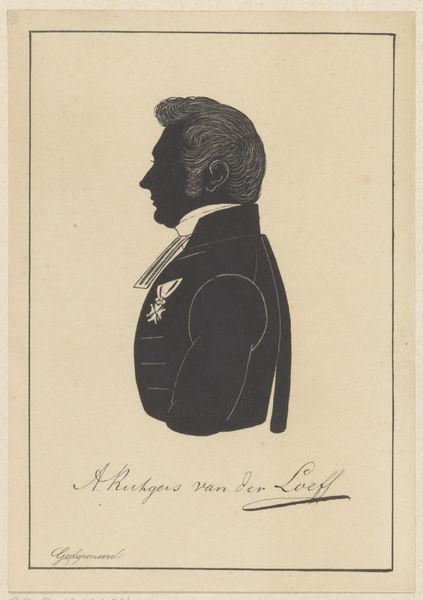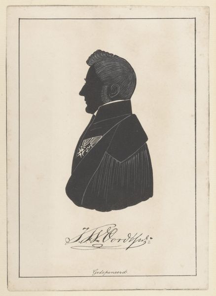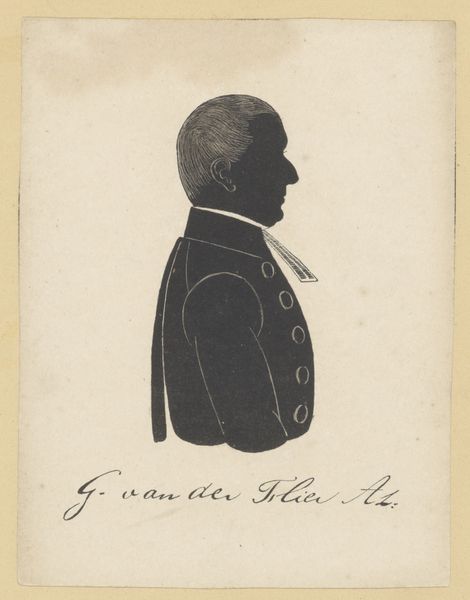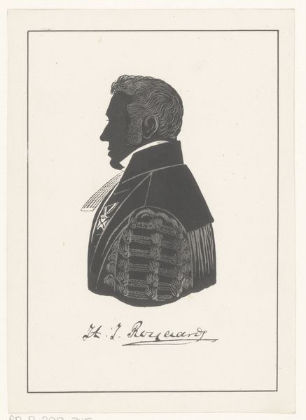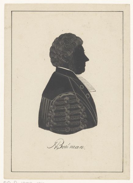 This is a silhouette portrait of Henricus Egbertus Vinke, made by Pieter Barbiers the Fourth. While undated, the piece gives us insight into the cultural and social conventions around portraiture during the artist’s lifetime. Silhouette portraits were a popular and accessible form of representation in the 18th and 19th centuries, offering a cost-effective alternative to painted portraits. In this example, the stark contrast between the black silhouette and the white background draws our eye to the contours of Vinke’s face and the details of his clothing, like the patterned fur on the cape. Consider the class and gender dynamics at play. The subject's attire signals his status, while the artist's skill in capturing likeness reflects the values of a society that prized both individuality and social decorum. What does it mean to capture someone’s identity through shadow? Perhaps it's a reflection on the parts of ourselves we show and conceal. The silhouette becomes a powerful symbol of presence and absence.