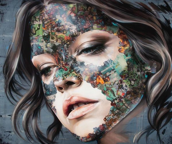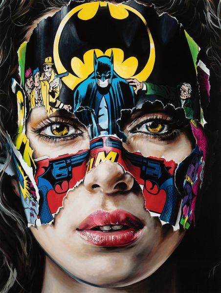 Editor: We’re looking at Sandra Chevrier’s 2018 mixed-media collage and acrylic painting, "La Cage; ne cherchez plus mon cœur, les bêtes l’ont mangé". There’s this hauntingly beautiful portrait…but her face is obscured by comic book panels. What does that juxtaposition mean to you? Curator: This piece, for me, is a potent commentary on the constraints placed on women in contemporary society. Chevrier cleverly uses the traditionally male-dominated imagery of comic books as a mask, obscuring the female subject. The title itself—"Don't look for my heart anymore, the beasts have eaten it"—is so evocative of vulnerability. How do the comic book panels interact with the realistic portrayal of the eyes, do you think? Editor: The eyes are so striking! They're realistic, soulful almost, contrasting the fragmented comic book visuals. It’s like they’re peering out from behind this constructed, almost aggressive, facade. Curator: Exactly! The "cage" isn't a literal one, but a societal one. Comic books, often associated with idealized and sometimes unrealistic representations of masculinity and femininity, act as a metaphor for the often conflicting expectations women face. What impact do the phrases bursting through the comic-panel mask have? Editor: There's "Snkt!" and "Chomp!" amidst what looks like dialogue bubbles. They sound… violent, almost animalistic. Is the artist perhaps talking about the consuming nature of those societal pressures? Curator: Precisely. The aggressive language and imagery layered onto a traditionally beautiful portrait force us to confront the ways external forces attempt to shape and often devour a woman's true self. The artist asks us to consider who creates and enforces the standards of female identity in the modern world. And who benefits? Editor: Wow, I hadn’t thought of it that way. It’s more than just a pretty picture; it’s a real statement. Curator: Absolutely. Chevrier uses visually striking art to provoke dialogue, challenging viewers to reflect on the complex realities of being a woman today.