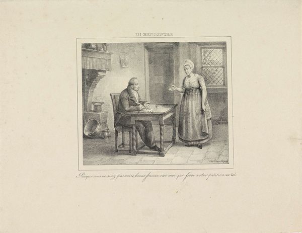 Pieter Tanjé created this print titled 'Jan Claasz of de gewaande dienstmaagd: de liefdesverklaring van Reinier Adriaansz' sometime in the mid-18th century. This print playfully stages social mores around courtship in the Netherlands. The scene depicts a well-dressed man, presumably Reinier Adriaansz, making a declaration of love to a woman. The woman, however, seems more aloof than enamored. Consider the setting: it's an interior, suggesting domesticity and the private nature of courtship, yet it's also carefully arranged. The presence of specific objects like the portrait, the window and the modest furniture point to the importance of status within Dutch society. Prints like this served as a form of social commentary, gently critiquing the rituals and expectations surrounding love and marriage. To understand the print more fully, we might explore the literature and popular culture of the time. These resources can help reveal the attitudes and anxieties surrounding courtship and social mobility in 18th-century Netherlands. Through them, we can understand the meaning that it held for its contemporary viewers.