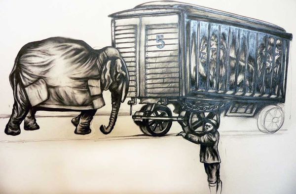 Curator: Welcome. We're standing before Sue Coe's striking piece, "Blind children feel an elephant". Editor: Immediately, I’m struck by the heavy atmosphere. It's dark, both in color and tone. The children clustered around the elephant seem vulnerable. It brings up a deep sense of pathos. Curator: Indeed. Coe often confronts power structures and social injustices, and this piece is no exception. Here, she seemingly juxtaposes the spectacle of the circus, represented by that poster, with the gritty reality of the industrial landscape behind them. Editor: The juxtaposition is stark. The city belches smoke while these children, marginalized perhaps by their blindness, tentatively explore an animal that likely suffers its own form of captivity within this environment. It all seems intertwined. Curator: Precisely. The work raises questions about how society treats the vulnerable. How those without power often find themselves at the mercy of systemic forces. It's noteworthy that circuses historically held problematic displays, from animal exploitation to ableist attractions. Editor: And note the poster's advertised price, “25c.” That price stands in sharp contrast to the intangible costs – the ethical costs – displayed so plainly across the broader scene. Is it that those with the least often pay the most, so to speak? Curator: Coe has used this motif, a common children's fable, to ask viewers to challenge these systems, to consider how these spectacles impact lives beyond simple entertainment. Also it brings questions on what they can and can't see; we all look at things with particular lenses. Editor: Ultimately, “Blind Children Feel an Elephant” is a visual metaphor laden with socio-political critique. Coe reminds us that ignorance is no excuse when structural oppressions define daily reality. It encourages engagement with complex relationships between humanity, animals, and environments. Curator: Absolutely. It encourages us to consider our own "blindness" to injustices within our systems and question who benefits from such systems remaining unchanged. Editor: A bleak reminder and a rallying call, all rolled into one scene. It challenges the role of imagery and the act of seeing.