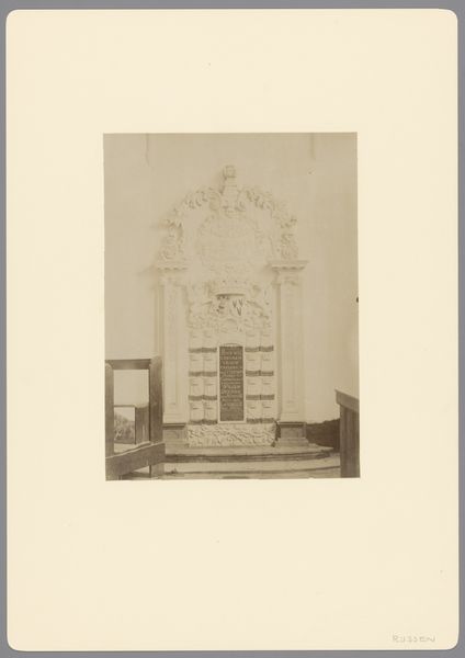 This sepia toned photograph depicts the grave monument of Transisalanus Adolphus van Voorst tot Hagenvoorde in the Nicolaaskerk at Wijhe. The monument itself is a complex arrangement of baroque forms, showcasing both a fascination with classical motifs and a dynamic sense of movement. The composition is dominated by a central structure that resembles an ornate pediment, complete with drapery effects, heraldic symbols, and sculptural elements. The eye is drawn to the figures of cherubs and other allegorical forms which flank a shrouded, urn-like shape. This artistic approach, where the boundaries between architecture and sculpture are blurred, reflects a Baroque sensibility that challenges fixed categories. The monument functions as a site where earthly power and spiritual ideals meet. The use of sepia tones in the photograph adds another layer of interpretation, where the past is not just represented but also framed through the lens of a specific photographic language.