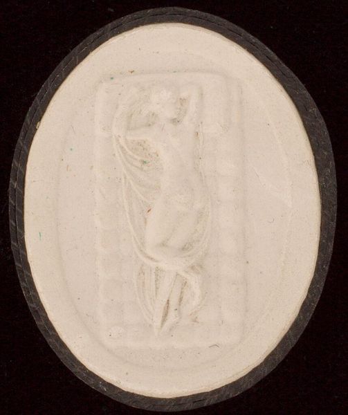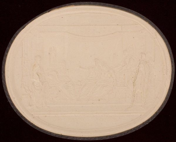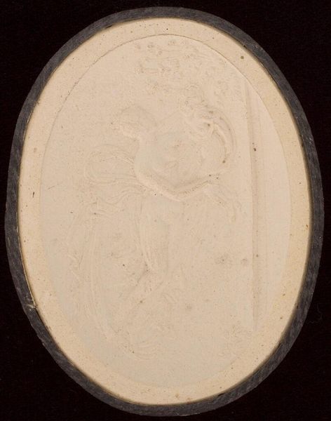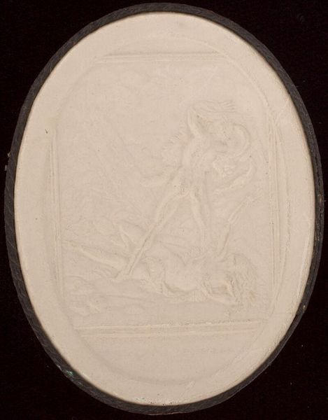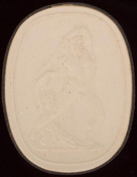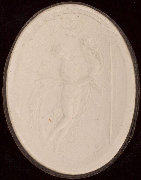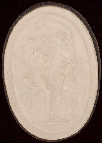 Editor: Here we have S. Passamonti's rendering of "Hercules and Lica, after Canova," a small plaster relief. It feels so classical, yet so...mass-produced. What can we read into the choice of material here? Curator: The plaster itself speaks volumes. Reproducing Canova, a master of marble, in plaster democratizes the image, making it available for wider consumption. Think about the means of production; plaster casts allowed for the easy replication of canonical forms. Editor: So, it’s less about high art and more about the accessibility of classical ideals? Curator: Precisely. The transformation of the myth into a commodity, readily available for display and consumption, shifts the focus from the heroic to the reproducible. What does that say about our relationship with these historical narratives? Editor: It changes my perspective to consider it a commentary on production and consumption. Curator: Indeed. The piece prompts us to consider value, labor, and the very materiality of art historical narratives.