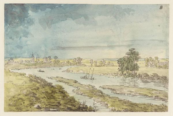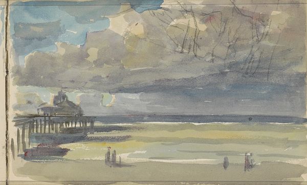 Editor: Here we have Daniel Burnham's "South Shore Park, Chicago, Illinois, Design Sketch," circa 1896. It's a mixed media piece featuring watercolor. What strikes me is how muted the colors are, almost dreamlike. What do you see in this sketch? Curator: I see an idealized vision of a public space, steeped in symbolism. The park itself becomes a symbol of civic virtue and progress, common in the City Beautiful movement of that era. The ordered rows of trees could symbolize rationality and control over nature. Do you get that sense of planned harmony? Editor: I do, now that you mention it! I was initially drawn to the haziness, but the composition is clearly structured. But is there more to it than just order? Curator: Absolutely! Consider the lake. Water often represents the subconscious, the emotional realm. So, while the park embodies conscious order, its juxtaposition with the lake suggests a need to balance reason with emotion. Editor: That's fascinating. It’s like the design hints at not just building a beautiful place, but also a balanced society, connecting with something deeper. Curator: Precisely! And this design wasn’t just about aesthetics, it was about shaping collective memory. Public spaces imprint themselves on a city’s identity, don't they? Editor: I never thought about it that way before, but that’s so true. Seeing this sketch now, it feels like more than just a pretty picture – it's a window into the hopes and ideals of a whole era.