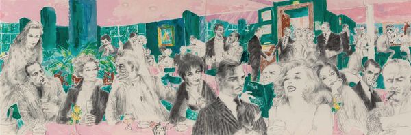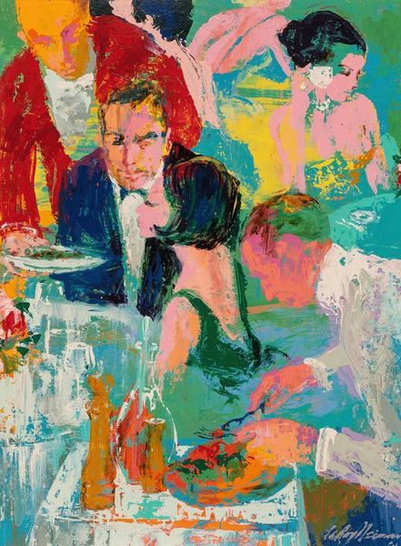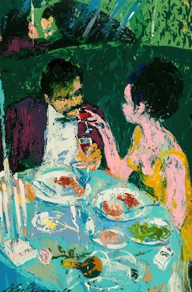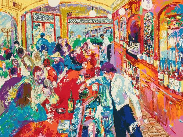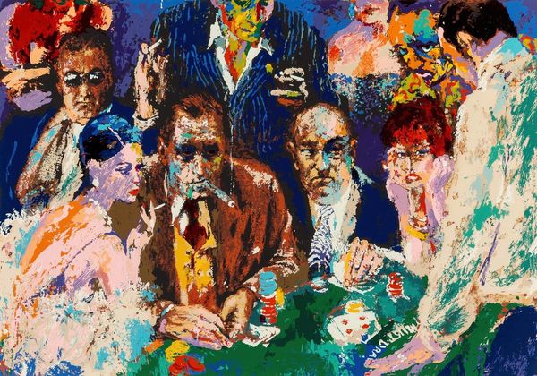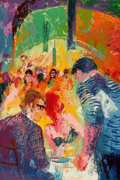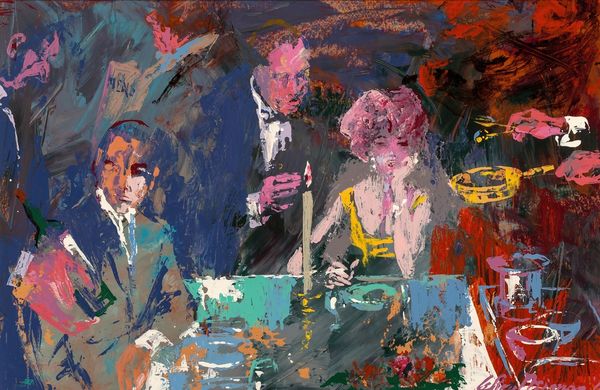 Curator: This lively canvas is LeRoy Neiman’s "The Pickwick Club," created in 1966 using acrylic paint. Editor: The immediate feeling is opulent and somewhat frenetic; all those clashing bright colors overlaid in heavy brushstrokes. Curator: Absolutely, and considering its context, that frenetic energy might speak volumes. The mid-60s marked an important era of social change, challenging established power dynamics based on race, class, and gender. Knowing this work represents a club scene allows one to interpret it through critical lenses examining access and exclusion. Who had access to these spaces, and what was the cost of entry, socially and economically? Editor: The physicality of the paint itself suggests a kind of frenzy, almost an aggressive application. Looking at the brushwork, you can see the artist really working the material. Were these vibrant acrylic paints a conscious decision, pushing back against the more subdued tones traditionally associated with the upper classes? Curator: Quite possibly! This ties into the work's Expressionistic style; an emotional response to social dynamics. Also the Fauvist element, with those non-naturalistic colours used very intentionally and emotionally. Neiman certainly wasn't interested in portraying reality. Editor: True, the raw quality makes you consider what Neiman’s labor looked like. How fast did he need to work to capture this scene's immediacy? The energy expended becomes part of the piece's meaning, especially when considering these depictions of leisure. Is he critiquing, celebrating, or simply observing the production of privilege? Curator: All great questions, particularly when applied to the themes of genre-painting and figuration so clearly evident. Neiman situates these figures inside identifiable social scripts that would have immediately communicated particular expectations to the audience. Knowing the figures might belong to an elite circle pushes us to explore what sort of ideology the artist attempts to unpack here. Editor: Looking again, it strikes me that the chandeliers are just as heavily impastoed as the figures. It’s all surface; no deep insight perhaps, just an immediate reaction to the glittering textures of wealth. It does offer a kind of material commentary, making it clear that these leisure spaces are manufactured—constructed out of material and labor, just as the painting itself is. Curator: Ultimately, what fascinates me is how the piece embodies tension, offering both an engaging image and space for considering complex social narratives, prompting critical conversations relevant to our contemporary experiences with class and power. Editor: For me, it’s how the painting lays bare its own means of production—that really stays with me. You are very aware of the surface and the manipulation of the paint and texture into form, creating something alluring yet somewhat unsettling.