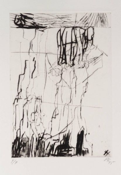 Editor: This print by Per Kirkeby features an intricate network of lines. I’m immediately drawn to the way the composition seems to both reveal and conceal a landscape. What strikes you about the formal elements? Curator: The insistent verticality of the lines creates a clear structural framework. Note how the artist uses hatching and cross-hatching to build tonal depth, yet avoids creating a fully realized pictorial space. Do you see how that tension functions? Editor: Yes, it's like the suggestion of a landscape is constantly being broken down by the abstract qualities of the lines themselves. Curator: Precisely. Kirkeby compels us to confront the materiality of the print, its lines, its composition. The semiotic function is deliberately destabilized, prompting contemplation on the artwork itself. Editor: That’s a helpful way to think about it. I’ll definitely look at prints differently now. Curator: Indeed, a rewarding exercise in understanding visual grammar.