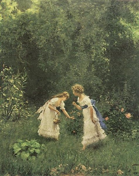 Editor: Here we have "The Glass Sphere," a painting by Alfred Stevens. It depicts a woman in a garden, gazing at her reflection in a large glass ball. There’s something both serene and slightly melancholic about it; she seems very absorbed. What do you see in this piece? Curator: This image speaks volumes about identity and the shifting nature of the self. Notice how the glass sphere presents a distorted reality. What does it mean for the sitter to seek her reflection in this manner, rather than a traditional mirror? Editor: That's interesting, I hadn’t thought about that. Maybe she's trying to see herself from a different perspective? Curator: Precisely. The sphere acts as a filter, altering her image, changing light and surroundings, thus inviting contemplation on appearance versus reality, inner thoughts versus the external world. Also, consider the traditional symbolism of spheres. They are often associated with totality, perfection, but also illusion. It’s quite powerful here. Does it reveal truth or conceal it? What do you think? Editor: I'm leaning towards illusion… it’s like she’s caught in a bubble. Maybe she's trapped by societal expectations of beauty or something similar? Curator: Excellent point. And how does this mirror our own constant self-evaluation in a world saturated with filtered images? The quest for identity is timeless, yet its visual representation continuously evolves, isn't it? Editor: It’s like the painting is reflecting my own anxieties back at me! I didn’t expect that. Curator: Indeed, great art often has that impact! Editor: I see this piece in a new way; thanks to your interpretations of symbolism in it.