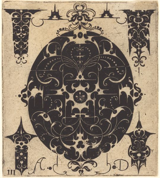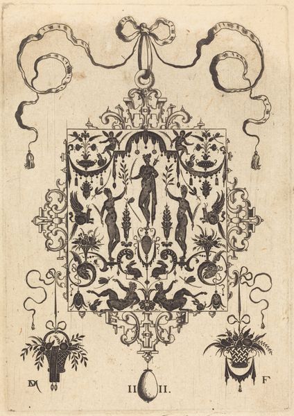 Editor: This engraving, "Title Page: Large Pendant, Venus and Amor at Centre" by Daniel Mignot, dates back to 1596. The density of the linework is striking, creating this ornate, almost overwhelming decorative scheme. What can you tell me about this piece? Curator: This dense layering speaks volumes. The sheer quantity of labor involved in producing such an intricate engraving highlights a very specific economic reality. Think about the workshops where these were made, the division of labor, and the value placed on skilled craftsmanship within that specific social context of 16th century printmaking. Editor: So, the technique itself reflects economic forces? Curator: Precisely. The print isn't just an image; it's a product of material conditions. What kind of consumption was Mignot trying to target? Editor: I see! Wealthy patrons who valued elaborate ornamentation for their collections or personal use? I’m wondering about the distribution. Were these luxury objects or were they becoming more widely available through printmaking? Curator: Both, potentially. Printmaking allowed for a wider distribution than unique artworks, shifting the notion of artistic ownership and access, even while maintaining its value through labor and material quality. How might the subject matter – Venus and Amor, allegorical figures – also reflect the consumer desires of the period? Editor: It speaks to Renaissance ideals of beauty and love, suggesting the patrons sought refinement but maybe something deeper regarding beauty ideals, and possibly marriage... Curator: Exactly! So we can read not only Mignot's skills, but cultural values and the early commercialization of art through the very material production of this engraving. The cultural aspirations as an integral component of its appeal, marketability, and, finally, its purpose. Editor: This is incredibly helpful; I'll definitely view these pieces differently from now on! Thank you!