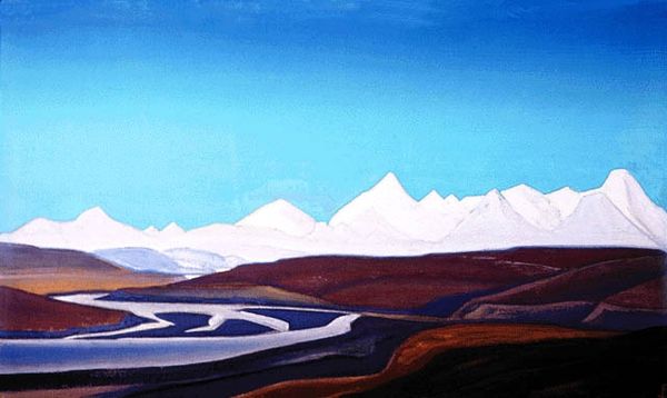 Curator: Looking at Nicholas Roerich's "Bogdo-Ul," painted in 1927, the first thing that hits me is the cool, almost glacial serenity. It’s like a hushed landscape holding its breath. Editor: It’s a deeply internalized landscape, wouldn’t you agree? The stark, cool palette emphasizes a dreamlike or visionary quality over pure observation. Mountain ranges ripple against a bright blue sky. There's something monumental and timeless conveyed by these hills; and what does 'Bogdo-Ul' mean? Curator: It translates roughly to “Holy Mountain” in Mongolian. Roerich was fascinated by the spiritual heartlands of Asia. This painting, done in oil paint, becomes almost an icon, stripping the landscape back to fundamental forms to highlight the power residing within it. For me, it suggests that our idea of 'holy' and its symbology could actually lie in our geographical homeland, like a 'here-and-now' paradise. Editor: The mountains almost become geometric shapes; he has flattened the perspective into layers, focusing more on conveying symbolic essence rather than creating a realistic view. Note the sharp outlines, the solid blocks of color…there’s an archaic quality reminiscent of early medieval icons. In other words, his romanticized style converges beautifully here with orientalist features to suggest symbolic spirituality, or his interpretation of it anyway. It makes me wonder what spiritual symbolism the mountains bear for people inhabiting this region today. Curator: Right, I suppose he's imbuing it with his own romantic sensibilities—perhaps a longing for a lost Eden, but still. The unwavering strength that the mountains suggest…maybe it is meant to nudge us toward seeking the sacred within the natural world, to really feel something profound with it rather than simply consuming it. It is a powerful call, if we only dare listen. Editor: Agreed. Roerich distills a place down to its archetypal essence, compelling us to remember and revisit a shared cultural narrative of spiritual power found in nature. Curator: Beautifully put! "Bogdo-Ul" feels like a summons and a solace—a painting that stills the noise and tunes us into something deep and elemental.