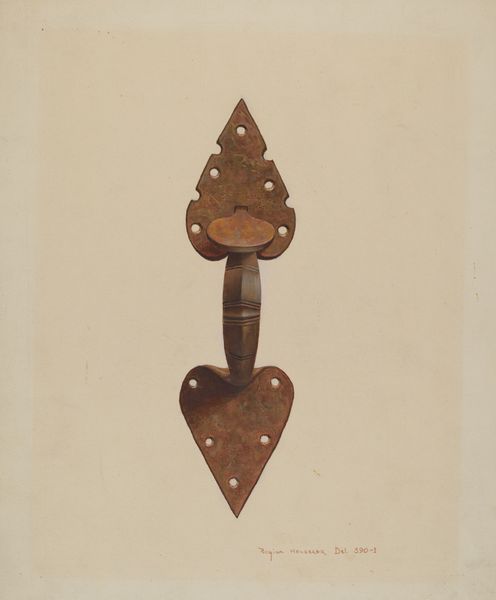 Regina Henderer made this watercolor of a ‘Suffolk Latch’ on paper, and look at how she embraces the stains, discolorations, and textures of the metal. It's as if Henderer is saying, "Hey, beauty isn't just about smooth surfaces." There's a real intimacy in how Henderer renders the latch. She’s showing us all the little pits and rust spots, and there’s something so tender about that. It is like she is saying that the wear and tear of daily life is what makes things beautiful. Take the lower heart shape, for instance; it's not perfectly symmetrical or smooth, but it's got this rough-around-the-edges charm that makes you wanna reach out and touch it. It's kind of like what Agnes Martin did with her grids, finding the sublime in the imperfect. Henderer reminds us that art can be found in the most unexpected places, even in the humble hardware that holds our lives together.