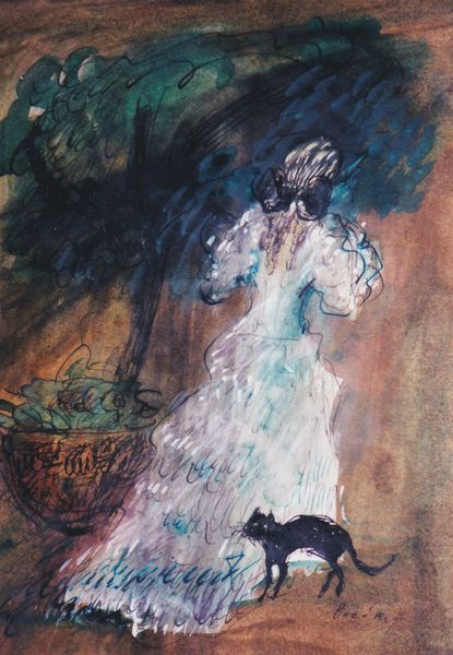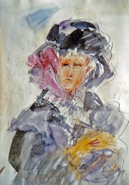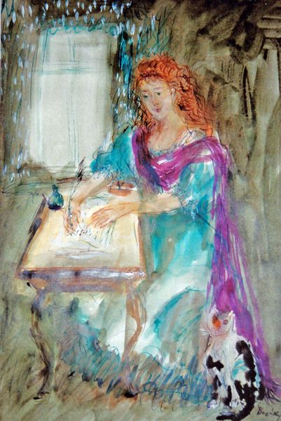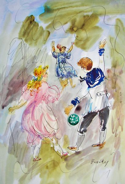 Maria Bozoky’s watercolor, Illustration #33 (Proust), is an expressive depiction of two women in a domestic setting. The painting’s composition immediately draws us in, with its delicate lines and translucent washes of colour that create a dreamlike atmosphere, evoking a sense of nostalgia. Bozoky's strategic use of line and colour, coupled with the semiotic interplay of the figures and setting, suggests a deeper engagement with memory and identity. The loose brushstrokes and unfinished quality challenge fixed meanings and suggest a world of fluid, subjective experience. The figures, rendered with an ethereal quality, seem to exist in a space between reality and imagination, mirroring Proust's exploration of memory. The painting's emphasis on fleeting moments and subjective experience aligns with a broader philosophical concern about the nature of time and identity. The work invites us to reflect on how we construct our own narratives through the lens of memory and interpretation.