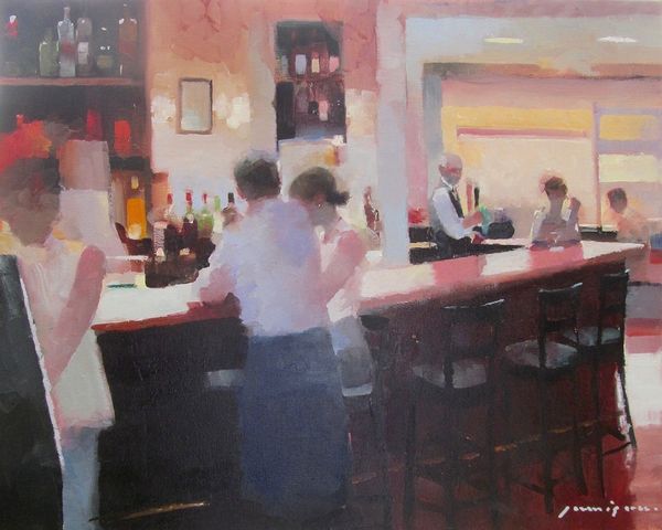 Curator: The title of this artwork is *The Staff* by Jeff Jamison. Painted with oils, this piece has an incredibly expressive take on interior figuration. I get the sense of place, but at the same time, the details blur and fade like memory. Editor: You know, my first reaction is that I feel like I'm peering into a dream. Everything seems softened, filtered through a rosy lens, perhaps hinting at the rose-tinted glasses we use to view idealized labor practices. Curator: Oh, I like that, framing it as labor. To me, the scene oozes this wonderful feeling of a bustling restaurant or bar. The staff, as in servers and bartenders, move throughout. Editor: It makes me think about the socio-economic structure in the hospitality business. Look at how those serving remain figures in the background. We don't get a true sense of their personalities, rather their positions within the infrastructure. It’s the architecture and coded geometries that dominate the scene. Curator: Yes, but for all the talk of that, don’t you think the charm in Jamison’s technique is how the light creates the details? The painting really shimmers, using light as an inviting guide for viewers. Like when you're drawn to the glow of a warm bar, it really has that quality. Editor: Right. What I read as a ‘softened’ experience could be the light. Yet, while warm and inviting, it is almost blinding, washing the potential exploitation behind the smile that good service relies on. Curator: Yes, absolutely. This light makes everything inviting! This particular artist uses a more personal touch and his creative expression through painting creates more nuanced commentary on society. Editor: A warm point of access, even though that glow might obscure some problematic histories of, say, service work or social interaction in such spaces. All in all, this piece brings up interesting things to chew on.