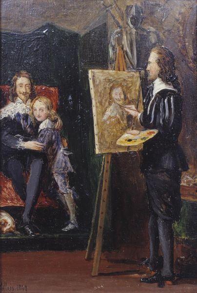 Curator: This is Wilhelm Marstrand’s “The Artist’s Wife and Children in the Studio at Charlottenborg,” painted around 1861-1862. Quite a mouthful of a title, isn't it? Editor: It certainly is, but stepping into the scene, you almost don’t need words at all. The feeling of controlled chaos in a domestic setting… it resonates instantly, doesn't it? Like a captured breath of family life. Curator: Precisely! Notice the somewhat theatrical composition. His wife appears in the doorway, almost like she is watching the play that unfolds. It makes you wonder: Is this staged, or is Marstrand merely capturing a moment in time? Editor: The staging absolutely adds to it. The light source seems to originate almost magically. The tambourine discarded in the foreground also seems ripe with symbolisms of joyous impermanence, domestic sounds that are beautiful and annoying at the same time, haha! Curator: A very apt summary, if I may say so myself. Look at his wife, though, so calm amid this joyous chaos. To me, the dark color of her attire gives a certain… somber weight against all that lively action. Do you feel like that darkness has any purpose to serve? Editor: It does. Visually, it anchors the painting; the dark mass provides balance and even serves as a memento mori; a visual marker that reminds us of life's fleeting moments, childhood itself. Her iconic presence evokes something timeless amid all that vibrant transience, don't you think? Curator: I cannot argue against it; the iconological symbolism rings perfectly right! What remains interesting to me is the location itself; this painting happens in his atelier, in the middle of the artmaking! To make an allegory for life itself? Perhaps he intends the domestic sphere and the art creation should happen at once! Editor: That’s a brilliant insight! Blending both worlds might speak about finding artistic inspiration within his family—observing and interacting directly. It gives a more complex reading to a simple genre scene. Ultimately, this painting acts like a hall of mirrors: A life is reflected inside an artistic endeavor; what can be more wonderful? Curator: You know, looking at it now, it feels more like looking at memories: fragments of a moment filled with family, nostalgia and love. It leaves you with a warm feeling, doesn’t it? Editor: Definitely a warm feeling; like opening an old photo album where someone preserved small gestures from a life already gone by. I guess that's the real power of imagery; time is suspended inside of a work of art!