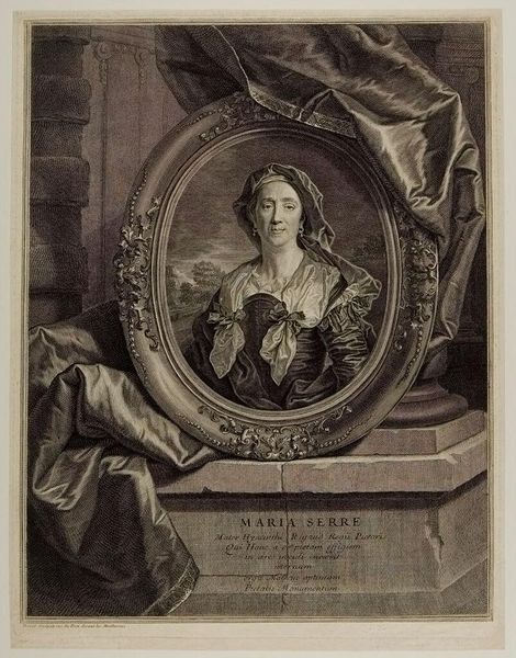 Editor: This is Pierre Drevet’s engraving, "Adrienne Lecouvreur (as Cornelia)." She looks so mournful, clutching what appears to be an urn. What do you see in this piece? Curator: I see a powerful statement on the limitations placed upon women, particularly actresses, in the 18th century. Lecouvreur was famously denied a Christian burial because of her profession. This print memorializes her as Cornelia, a Roman woman celebrated for her virtue, yet Lecouvreur herself was denied that recognition in life. Editor: So, the artist is making a commentary on societal hypocrisy? Curator: Precisely. Drevet uses the visual language of classical virtue to critique the rigid social structures that condemned Lecouvreur. How does this reframing impact your reading of the artwork? Editor: It definitely adds a layer of complexity, making me consider the power dynamics at play. Curator: Exactly! And how art can challenge them.