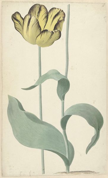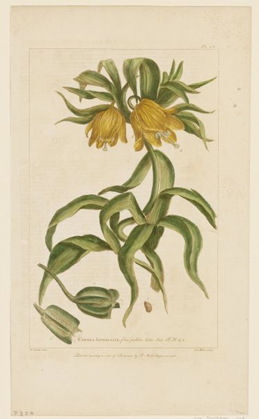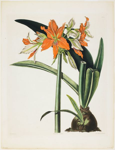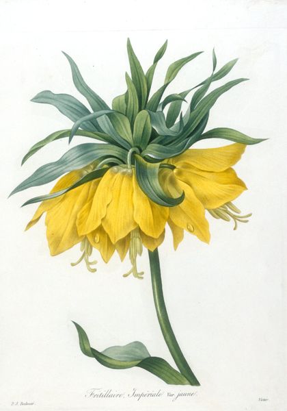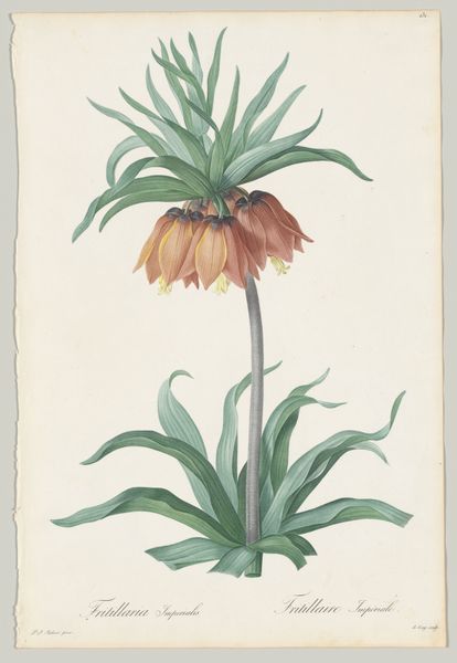 Editor: Here we have Pierre Joseph Redouté's "Fritillaire Imperiale," from 1827. It appears to be a print, and perhaps also some watercolor? It's quite striking—the composition is so formal and precise. What do you see in this piece, focusing on its visual elements? Curator: I'm drawn to the structure. Observe the radial symmetry; the leaves at the top forming a kind of crown. Note, too, the deliberate gradation of colour, moving from the blues and greens through to the oranges. How would you describe the way Redouté uses line in the petals? Editor: I notice the lines are very delicate, almost like he's trying to capture the texture of the flower. They create a sense of depth. Are you suggesting the visual forms evoke something beyond the image of a flower? Curator: Precisely. Think about how the controlled, almost mathematical, arrangement plays against the natural, organic form of the plant. This tension animates the image, elevates it from simple representation towards a constructed ideal. Do you see that? Editor: I do now. The precision is key. Without it, the flower might appear ordinary, but the tight rendering transforms it into something… more. It's an exercise in idealized form. Curator: And in that tension we find the artwork’s success, I think. Editor: Absolutely. I came in seeing a pretty flower, but now I notice a dialogue between structure and nature, ideal and reality. Thanks for the insight.