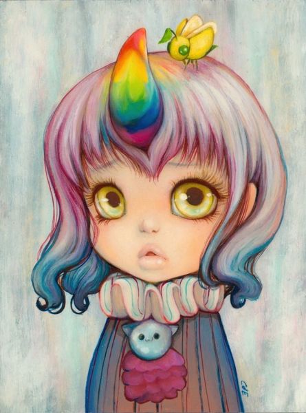 Editor: So, this is "Bombus" by Camilla d'Errico, from 2020. It looks like it's acrylic paint. It's kind of whimsical, a little girl holding what looks like a technicolor bumblebee. It's a little unsettling, to be honest, but in a cute way. What do you see in this piece? Curator: Let us observe the interplay of figuration and color. D'Errico uses acrylic to create a smooth, almost porcelain-like finish on the child’s skin, a stark contrast to the fuzzy texture of the…bombus. The juxtaposition draws attention to the artist’s control of medium and surface. What effect does this tactile difference produce? Editor: I guess it makes the bee seem almost unreal, like a plush toy rather than a real creature? The textures really clash. Curator: Precisely. Consider also the portrait format: the figure is centered, the background muted. The limited palette emphasizes the visual impact of the bee, directing our gaze and potentially acting as an allegorical figure representing transformation, like in surrealist art. The rainbow could point to this, by the way. Editor: So you are saying that the bee's disruptive color scheme affects the interpretation? Curator: It becomes central to our formal reading, yes. Disruptive isn’t quite the correct term, rather heightened through contrast with the girl's duller pallor. What is your impression of her face? Editor: Her wide-eyed expression? It's a common feature in a lot of contemporary portraits. There is also an element of wonder, or confusion maybe? Curator: Yes, it provides a counterpoint. Through close examination, the artist uses visual contrast to spark interpretive activity from the viewer. Editor: This has given me a different way to appreciate the balance of it all, I definitely look at it differently. Thanks! Curator: My pleasure. Hopefully it has offered insight into the process of rigorous looking and evaluation of technique.