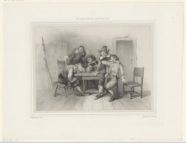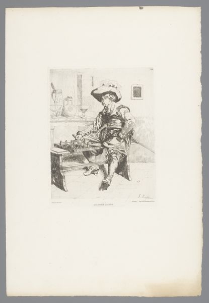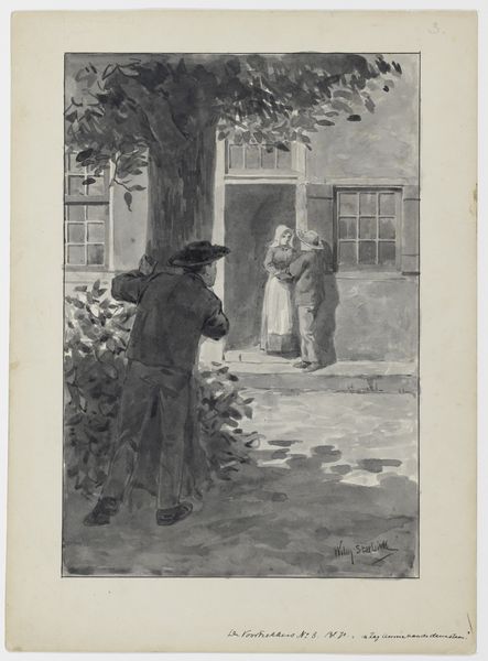 Willem Steelink created this drawing, titled 'Two pioneers in front of a house', using pen in grey ink and brush in grey wash. The composition stages two figures against a building facade overtaken by foliage. One figure is seated, the other stands, holding what appears to be a smoking pipe. Steelink’s calculated use of monochrome brings a textural richness to the scene. Notice how the tonal variations create depth and volume, giving a weighty presence to the figures. The formal structure of the drawing invites a semiotic interpretation. The men, presumably Voortrekkers, are coded through signifiers such as their clothing and tools. These signifiers are intended to evoke narratives of pioneering, connecting the image to a broader cultural discourse around nationalism and identity. The choice of medium, a relatively informal drawing, suggests an engagement with the everyday lives that departs from traditional heroic portrayals. The artwork operates as a study in contrasts—between light and shadow, stasis and activity—reflecting the complexities inherent in representing historical subjects. The use of drawing disrupts expectations, inviting viewers to reconsider the relationship between form and meaning in historical representation.