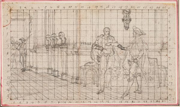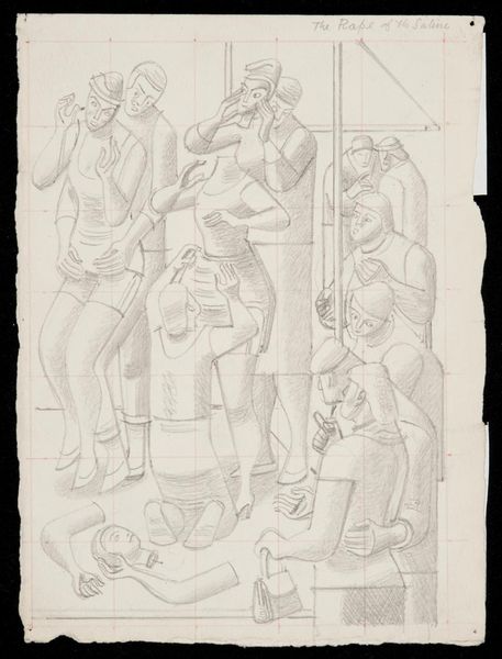 Editor: This is William Roberts' "Study for 'The Tea Garden.'" It's undated, but rendered in pencil. It feels so regimented, almost like everyone is a character in a play. What symbols do you see here? Curator: The grid beneath the sketch hints at a desire for order amidst the social scene. The figures are abstracted, almost geometric, suggesting a controlled, perhaps even a sterile, environment despite the implied leisure. How does the presence of the tree modify this feeling? Editor: I think the tree softens it, suggesting a return to nature. Curator: Exactly. It's a powerful juxtaposition. Roberts captures a tension between nature and social artifice, reflecting a broader cultural memory of seeking refuge from industrialization. It's about the symbols of comfort clashing against the symbols of progress. Editor: I hadn’t considered it that way. Thanks. Curator: It's fascinating how a simple sketch can encapsulate so much, isn't it?
