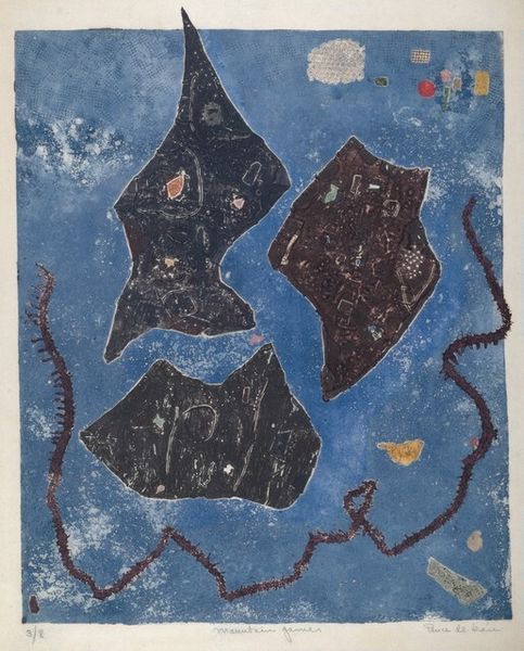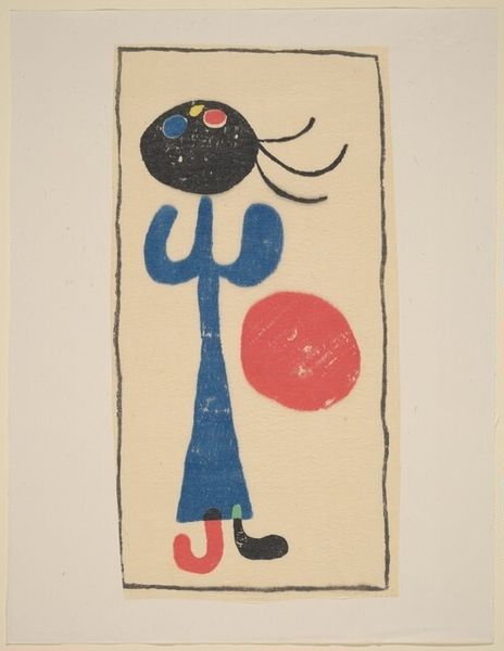 Editor: Here we have Joan Miró's "Untitled [plate XLV]", a mixed-media print from 1958. The shapes seem simple, almost childlike, but I can't help feeling a certain sense of mystery and wonder emanating from the overall composition. What strikes you about this work? Curator: The first thing that arrests the eye is the spatial interplay. Notice how the central ochre shape, almost an island, floats against the stark white of the paper. It immediately begs the question: how does this deliberate placement inform the overall structure? The crude textures of the ochre ground become another signifying component to analyse: Do these disruptions denote ruin? Renewal? It's worth considering. Editor: That's interesting. I was focused more on the individual shapes themselves. The red circle, the blue star, the small, figure-like form. Curator: But are they shapes in isolation, or do they gain significance only through their interaction within this contained plane? Think of the strategic arrangement: the chromatic relations that determine the overall rhythm and coherence. Editor: So you're suggesting the relationship *between* the elements is more important than the elements themselves? Curator: Precisely. Miró, a master of visual semiotics, utilizes these pictorial strategies to create an internal dialogue; through form and composition, a specific experience occurs in the artwork. Editor: I see what you mean! Looking at it now, I realize the brown, star and red, plus the little being are really relying on the position, texture and form within the composition. This makes me want to explore all his prints now. Curator: Yes, an engagement with the materiality can produce different readings over time. The beauty of formalism.