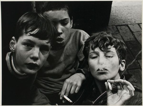 Curator: Esther Bubley's 1942 gelatin-silver print, "Children at Church, Washington, DC," captures a poignant moment of young individuals seemingly waiting for a church service to begin. What's your immediate reaction to this piece? Editor: The contrast is what immediately grabs me – the sharp light and dark areas create such a textured feeling. You can almost feel the stiff wool of their coats and the cool smoothness of the paper they're holding. There's something quite material about this capture. Curator: Indeed, Bubley's photograph is powerful, and in considering the historical context, particularly during wartime America, it reflects themes of innocence, anxiety, and the pervasive impact of larger societal forces on the everyday lives of children. We have to acknowledge this framing when discussing it, not merely an 'art object.' Editor: I agree. The work has that period look – the clothes, the paper pamphlets, and yes, the children's postures give insight into wartime pressures on the very young. But look at their garments! Such specific fabrics—the woven nature communicates to me an economy of labour: someone's care to weave and sew those clothes, even during war rationing. Curator: Absolutely. Furthermore, these children likely have an acute awareness of gendered roles, both inside and outside the home. What expectations were placed upon them simply due to their identities in 1942, influenced how they were parented? Editor: A good point, considering. And it gets back to production for me: Even the paper handouts that are distributed; everything visible hints to different kind of labours that structured this image to being. There’s nothing spontaneous here. Curator: Precisely. Bubley, while working for the FSA, or later for Standard Oil, always presented a strong argument regarding race and class in her art. This piece prompts reflection on how children, regardless of race or class, were socialized within distinct environments in a segregated society and their individual ability to confront such an established bias. Editor: So well said. This conversation illuminates a fascinating connection; what initially seems like just a captured moment also illuminates a wider perspective on class, race, material culture, and what it all meant to society at that time. Curator: Thank you. For me, revisiting it reminds me that any artwork serves as a lens for contemporary discussions, hopefully promoting discourse about identity and social equality through both our lenses.