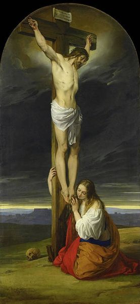 Curator: Here we have "Crucifixion" by Charles Le Brun. The work is an oil painting showcasing the Baroque style, notably using chiaroscuro techniques. What are your first thoughts? Editor: It's certainly striking. Melancholy and serene at the same time. The angels seem to float in a perpetual, pained orbit. You almost expect them to sing a mournful lullaby. Curator: Le Brun masterfully uses light to emphasize Christ's body, drawing the viewer's eye immediately. There is something powerful about the human form depicted in such a state, especially when you consider the process of oil paint, building layers, constructing the visual impact over time. Editor: Exactly. Look at those tiny figures huddled at the base of the cross in comparison to the divine agony showcased above. Almost swallowed by darkness! This darkness is then punctuated with the chubby putti that recall that cherubic, even saccharine sentimentality. Quite Baroque. Curator: This historical context shapes everything. The Baroque loved grandeur, drama, emotional intensity. These qualities serve political power and also religious fervor during the Counter-Reformation. And it is hard to ignore the role of the patron and the workshops in such large-scale endeavors. Editor: It’s the narrative of faith rendered through oil and canvas, a meditation on mortality and hope... all that darkness! I almost want to believe it has an inner light radiating through it somehow. Curator: A testament to Le Brun’s technical skill and an emblem of a very specific moment in cultural history. Considering the economic investment and networks needed for paintings of this scale to emerge from workshops, one understands this object becomes an artifact that stands in for complex forces beyond artistic intention. Editor: True. Standing before it now, the image holds its story… even if it also prompts our own interpretations. What a complex legacy. Curator: Indeed. A fusion of artifice, material labor, and religious power visualized with undeniable artistry.