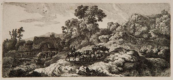 Editor: Here we have Ferdinand Kobell's etching, "Cascade." It feels like a snapshot of a specific moment in time. What social dynamics do you see embedded in this landscape? Curator: I see a deliberate construction of nature, framing it as a space accessible primarily to a privileged class. The figures on horseback, positioned prominently, are they landowners, perhaps? Their presence within the landscape subtly reinforces a power dynamic, a claim of ownership and control. Editor: That's fascinating! I hadn't considered the power implications. Curator: Consider also who is missing. Where are the laborers, the indigenous populations? Their absence speaks volumes about the historical narrative being presented. Editor: It really changes how I see the image now. Thanks for pointing that out. Curator: My pleasure. Hopefully it inspires critical reflection.
