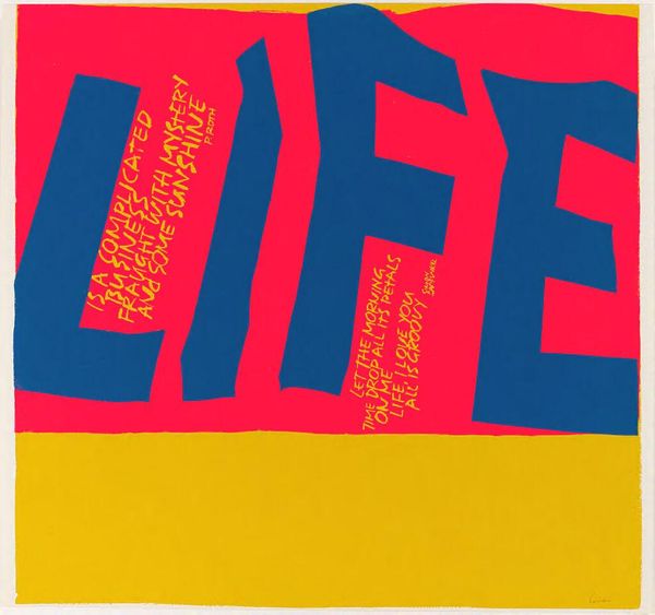 Curator: Corita Kent's screen print, titled "one way," presents a bold exploration of color and form. Look at how the red and blue interlock. Editor: It's vibrant, almost aggressively so. It feels like a visual shout, doesn't it? Those stark color contrasts hit you right away. Curator: Indeed. Note how Kent layers fragmented text amidst abstract shapes. Semiotically, the interplay challenges conventional modes of reading. The text becomes both message and visual element. Editor: Right, it's a collage of words and shapes. "ONE WAY" really pops, but then you notice all these little snippets around it. It’s like a visual poem. Curator: Precisely. And consider the socio-political context of Kent's work. Her embrace of pop art aesthetics served as a means of democratizing art, making it accessible. Editor: It feels like a call to action, a burst of energy for change. The imperfections give it a very human feel; it's not trying to be slick or polished. Curator: An astute observation. The piece deftly merges formal innovation with social commentary. Editor: I’m walking away with a feeling of optimistic rebellion. It’s like a little jolt to the system.