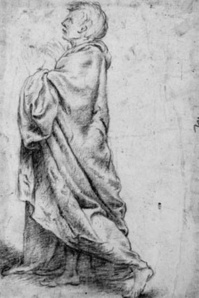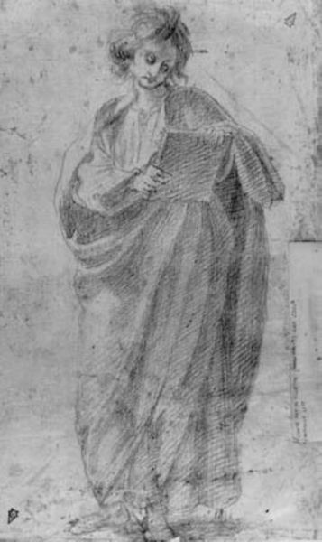 Albrecht Durer made this drawing of St. Paul using pen and ink, sometime in the late 15th or early 16th century. This image exemplifies the period's renewed interest in classical forms, while also serving the religious function of representing a key figure in Christianity. Durer was working in Nuremberg, a hub of the Holy Roman Empire and a center of humanist scholarship during the Reformation. His artistic skill was fostered by the city's wealth and its printmaking industry. Paul is shown holding a book, a symbol of his epistles, and standing near a sword, representing his martyrdom. Note that Durer's skill lies in the rich texture and shading achieved through precise pen work. As historians, our understanding of this image is not just about its artistic qualities but how it fits into the religious, economic, and intellectual environment of its time. Investigating the social and institutional context allows us to gain a more comprehensive appreciation of Durer's artistic achievement.